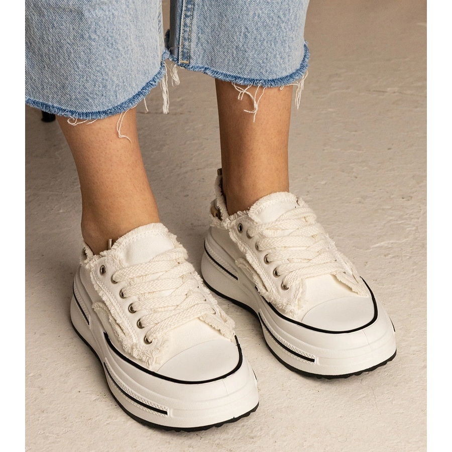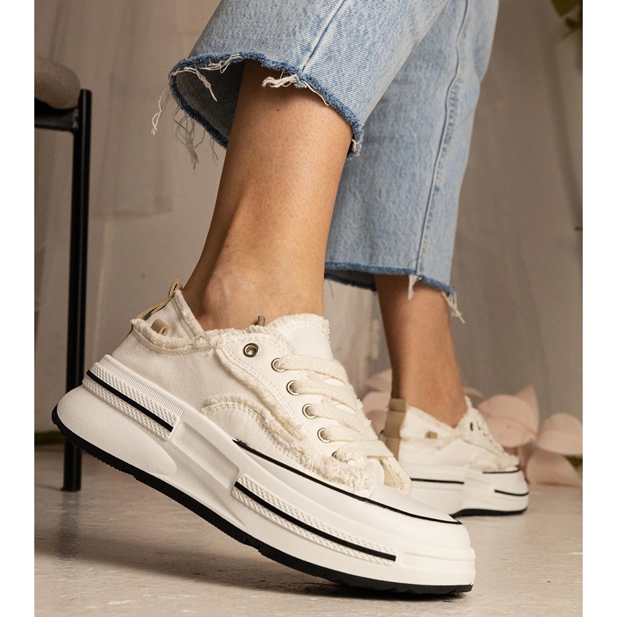 Les baskets se distinguent par un design classique, avec un nez rond et un fermoir à lacs, ce qui le rend plus facile à mettre et à s'adapter au pied. La couleur blanche fraîche du tissu extérieur contraste avec la semelle noire, donnant à l'ensemble un look moderne et attrayant. La plate-forme de 4,5 cm de haut allonge non seulement la figure optiquement, mais offre également un confort lors de longues promenades ou des activités quotidiennes.