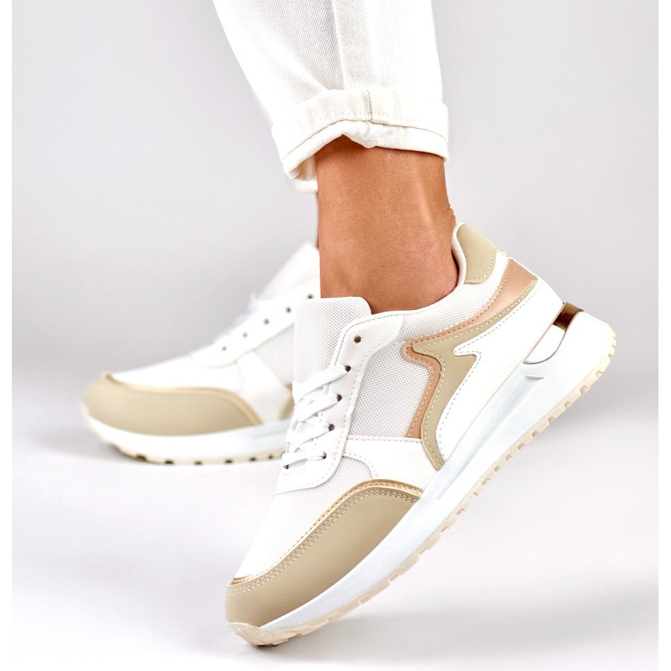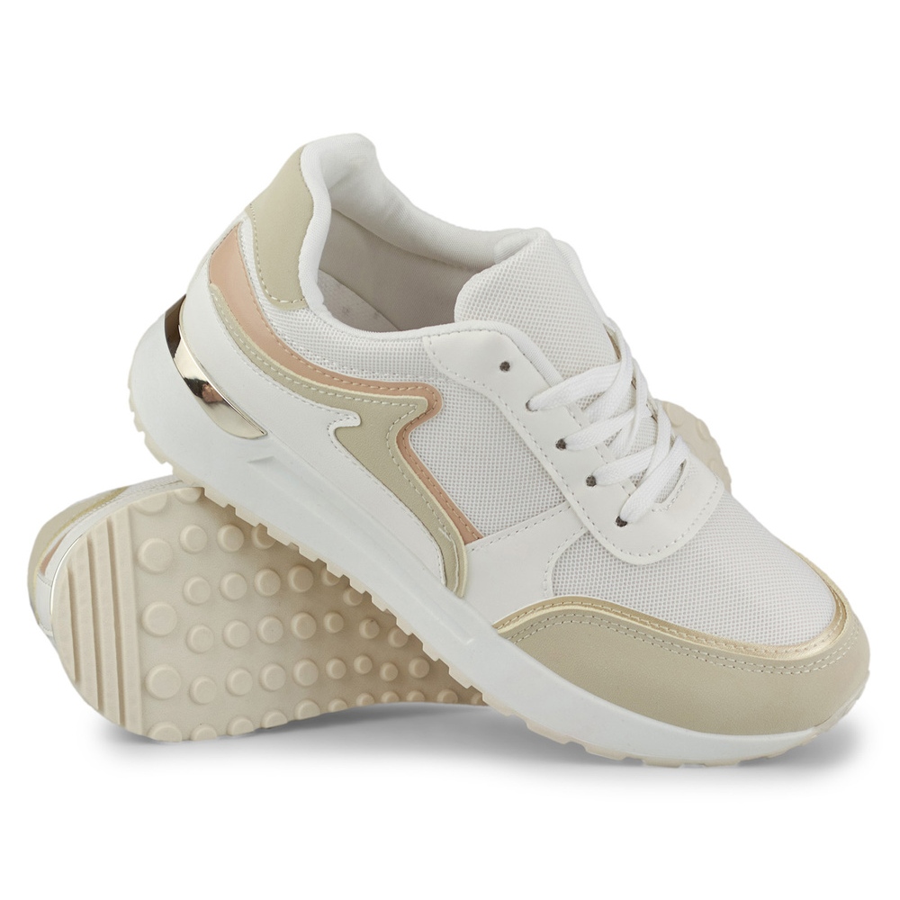 Ces baskets pour femme sont fabriquées par la marque Inna et font partie de leur collection KeeShoes. Ils sont beiges avec du doré. Les chaussures sont basses, avec une fermeture à lacets et un bout rond.