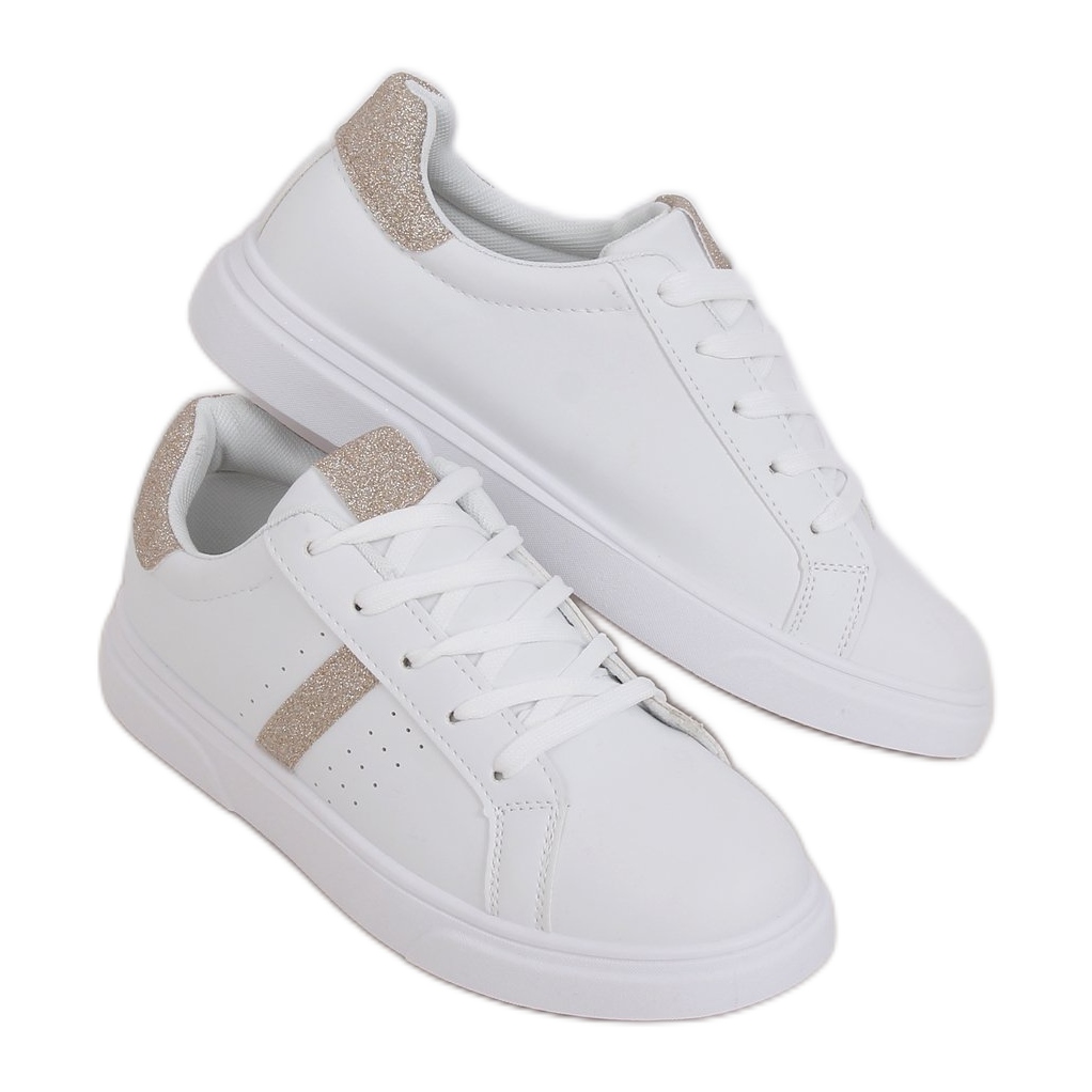 Les baskets sont disponibles dans une couleur blanche universelle avec d'élégants accents dorés, ce qui en fait un excellent choix pour les pantalons et les robes d'été. Leur fermeture à lacets assure un ajustement parfait, et le bout rond ajoute de la légèreté à l'ensemble du style.