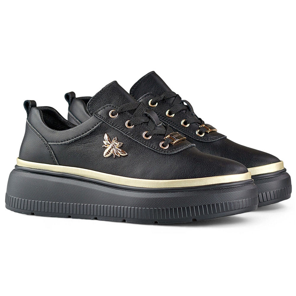 Baskets femme en cuir noir avec accessoires dorés