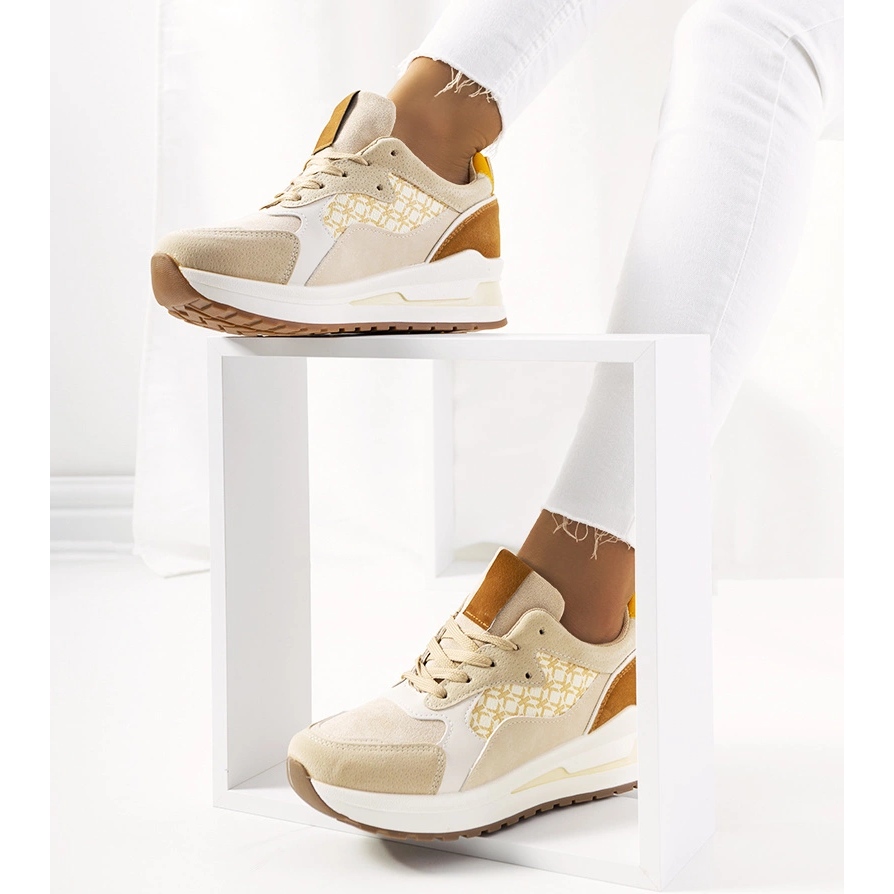 Minimaliste et en même temps plein de caractère - des baskets beige en beige est une proposition pour les fans de style sportif urbain. Les sports coupés avec des détails intéressants et la semelle blanche contrastée compléteront parfaitement des stylisations décontractées et plus féminines. La semelle haute (plate-forme de 5,5 cm) ajoute la légèreté et un look à la mode - doit avoir cette saison.