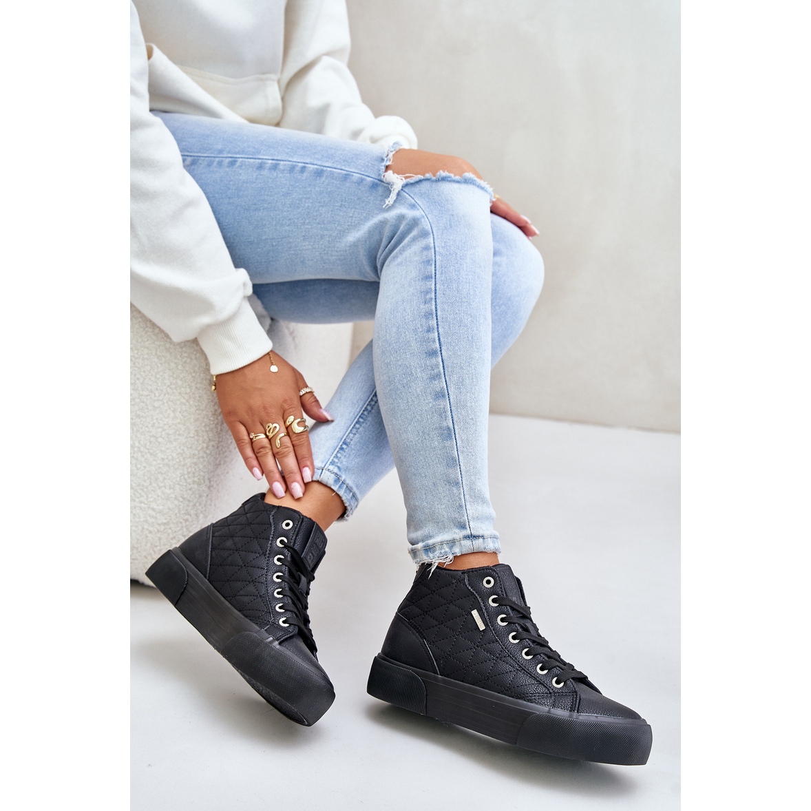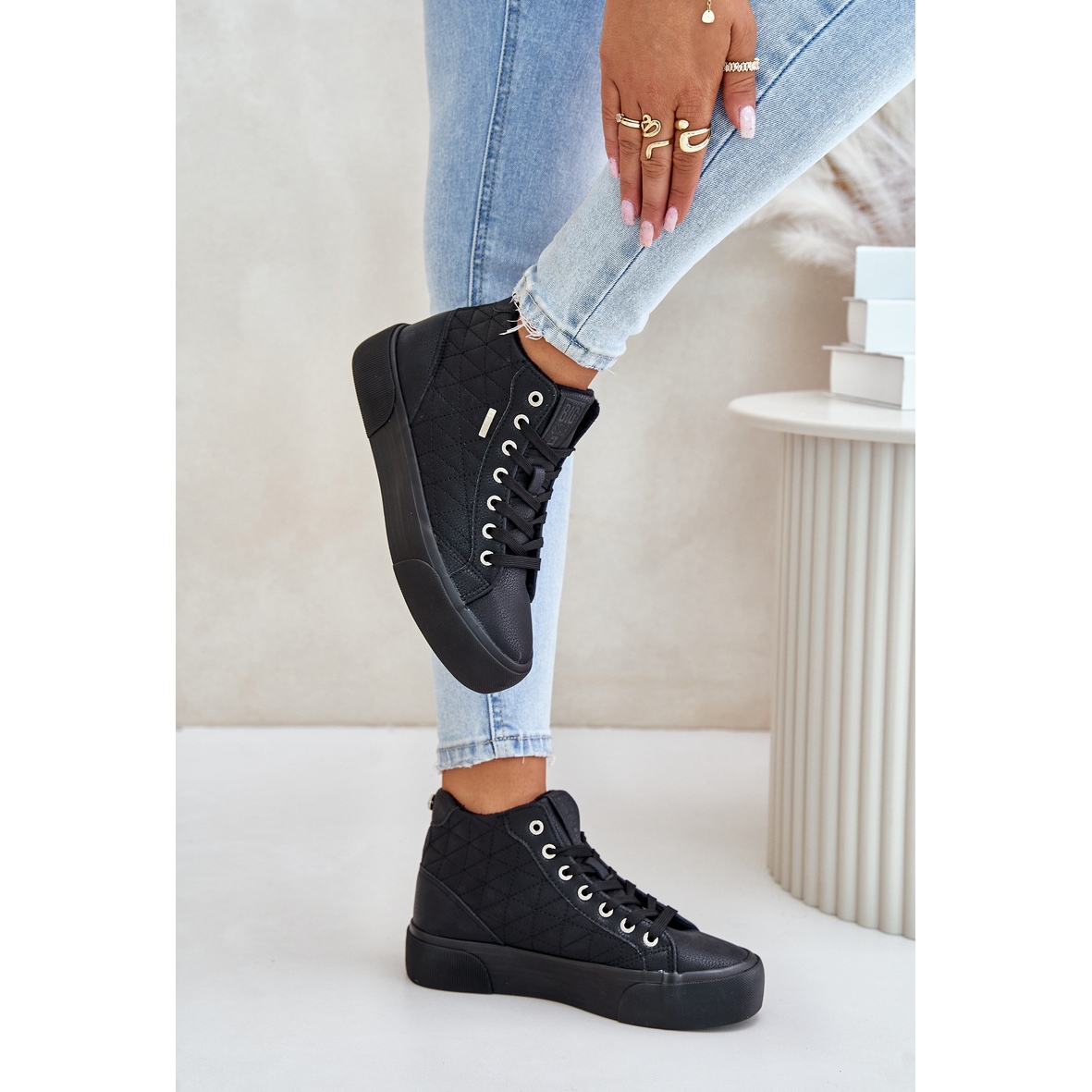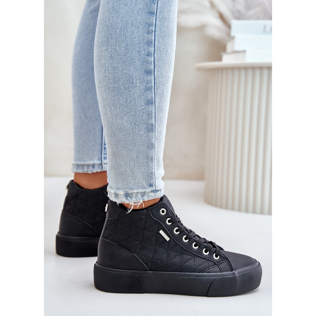 Les baskets ont une tige haute mesurant 11 cm et une plateforme de 3,5 cm de haut, ce qui donne un effet de légèreté visuelle et de dynamique. La largeur de la tige est de 10 cm, ce qui rend les chaussures adaptées à de nombreuses morphologies. Les semelles en caoutchouc noir sont à la fois durables et faciles à nettoyer, et le bout rond ajoute du charme.