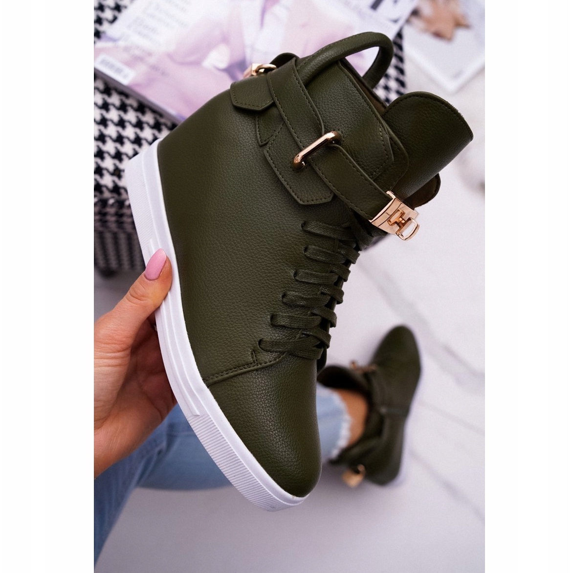Nous vous présentons d'extraordinaires baskets compensées pour femmes dans une belle teinte olive ! Le modèle Tersey est la combinaison parfaite de confort et de style qui attirera sûrement l'attention de tous. Inspirées des dernières tendances, ces baskets se distinguent par des accessoires dorés sous la forme d'un impressionnant cadenas et d'une fermeture éclair, qui leur confèrent un caractère unique.