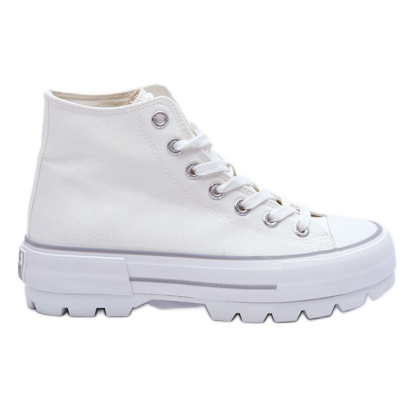 High Women's Sneakers Big Star LL274156 - White, sur la plate-forme 3,5 cm. Un modèle moderne et universel combinant un personnage sportif avec style urbain. La cheville supérieure en tissu respirant, avec un talon légèrement raidi pour une meilleure stabilisation. Une semelle épaisse et en caoutchouc avec une bande de roulement claire tient en toute confiance sur diverses surfaces.