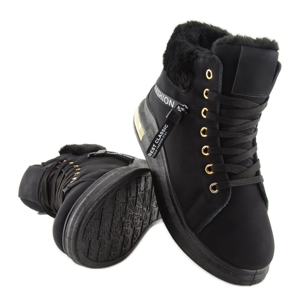 **Les baskets isolées noires W19-25** sont le choix parfait pour les femmes qui souhaitent allier confort et look tendance les jours d'hiver. Ces baskets élégantes à semelles hautes se distinguent non seulement par leur esthétique, mais aussi par leur fonctionnalité. Isolés avec une fourrure douce, ils offrent chaleur et confort, ce qui en fait une solution parfaite pour les journées glaciales.