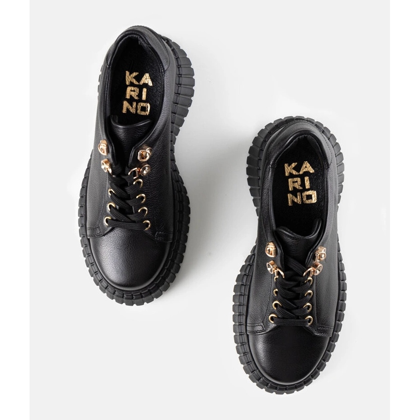 Sneakers en cuir noir Karino est le choix parfait pour les femmes qui souhaitent combiner un style à la mode avec un confort exceptionnel. Leur design élégant et minimaliste avec un nez rond en fait un complément parfait aux stylisations quotidiennes et estivales. Fabriqués en cuir naturel de haute qualité, ces chaussures basses en dentelle garantissent la durabilité et le confort de l'usure pendant longtemps.