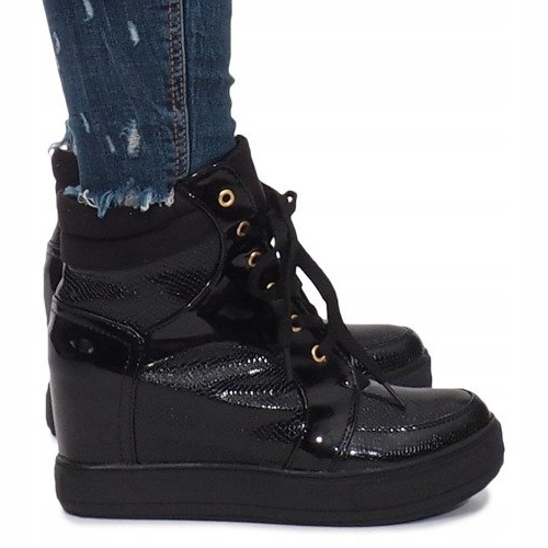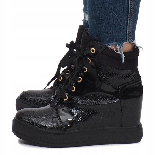Les baskets compensées Snake vernies noires sont un choix parfait pour les femmes qui souhaitent allier élégance et confort. Ces chaussures élégantes, avec une hauteur de cale d'environ 7 cm, se distinguent non seulement par leur design tendance, mais aussi par leur finition précise.