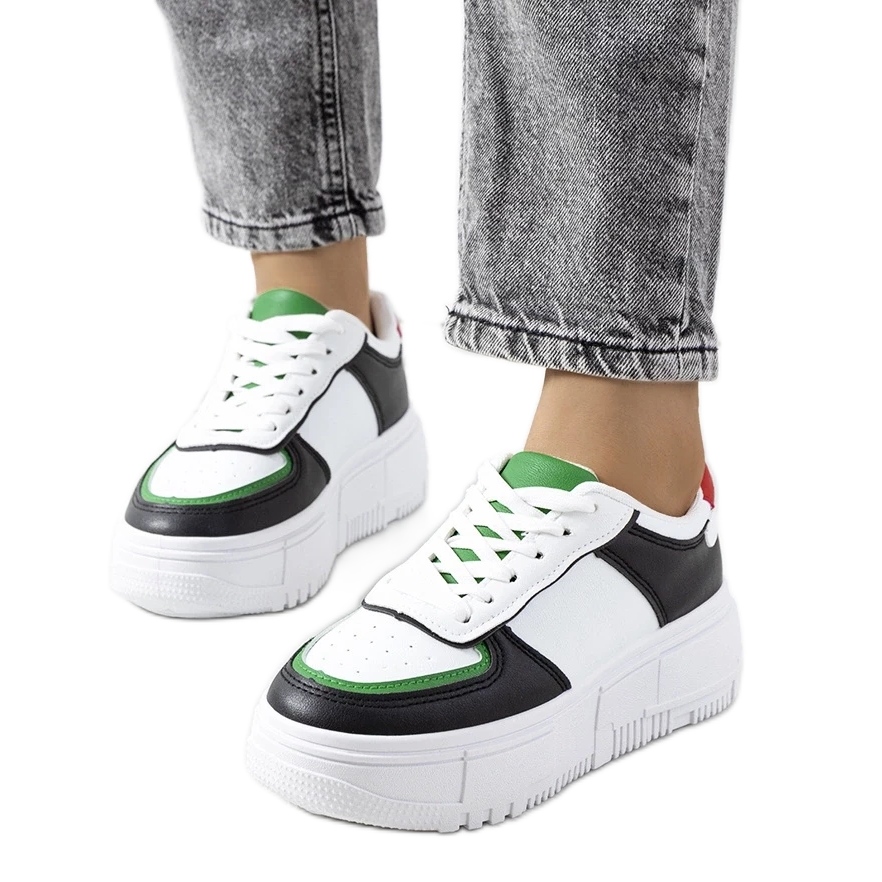 Fabriquée en écos-cuir de haute qualité, les baskets mandib se réjouissent avant tout des inserts extrêmement élégants avec une partie écologique dans une couleur blanche enneigée, ce qui contraste parfaitement avec la base noire. Une telle combinaison de couleurs garantit que vos stylisations gagneront un caractère unique. Ces baskets seront un excellent complément aux tenues décontractées et plus élégantes au printemps et en été.