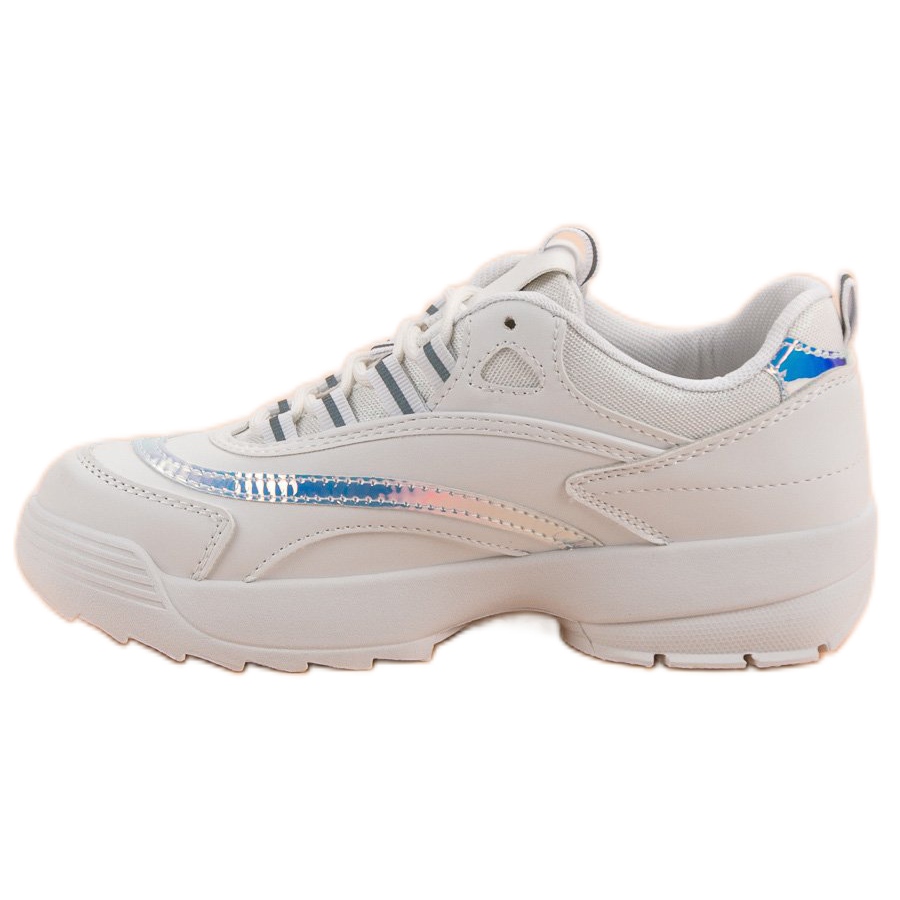 Découvrez une nouvelle dimension de chaussures de sport avec les baskets Fashion blanches. Ces chaussures extrêmement élégantes allient un design futuriste à un style traditionnel et sportif, parfaites pour un usage quotidien. Le blanc classique est enrichi de rayures métalliques qui scintillent de couleurs arc-en-ciel, ajoutant un caractère unique à votre style.