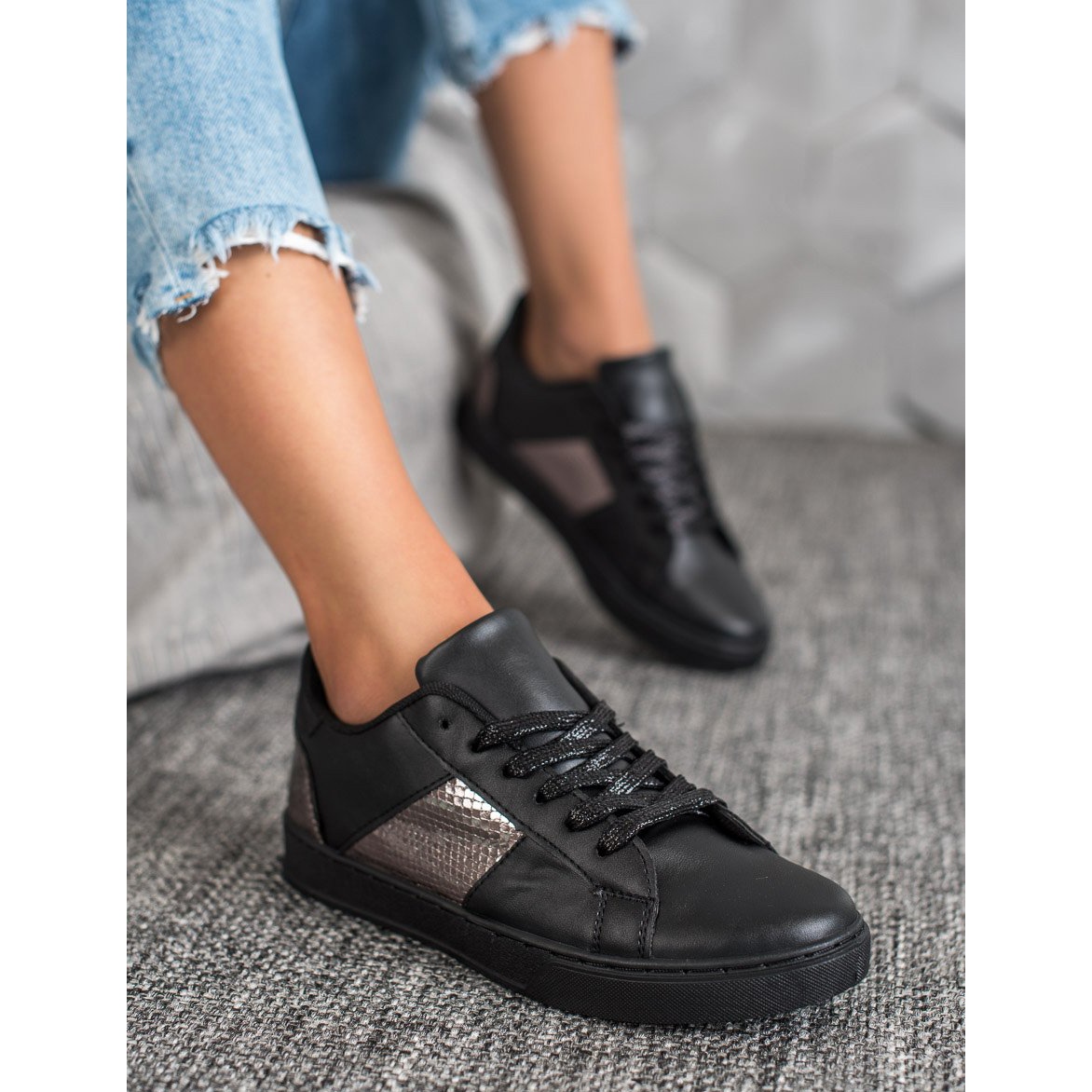Découvrez une mode pleine de confort avec les baskets Emax d'une élégante couleur noire. Ces chaussures de sport pour femmes répondront aux exigences des utilisatrices occasionnelles comme des plus stylées. Fabriqués dans un matériau semblable au cuir, avec des inserts originaux imitant la peau de serpent, ils attirent l'attention et ajoutent un caractère unique à n'importe quel style.