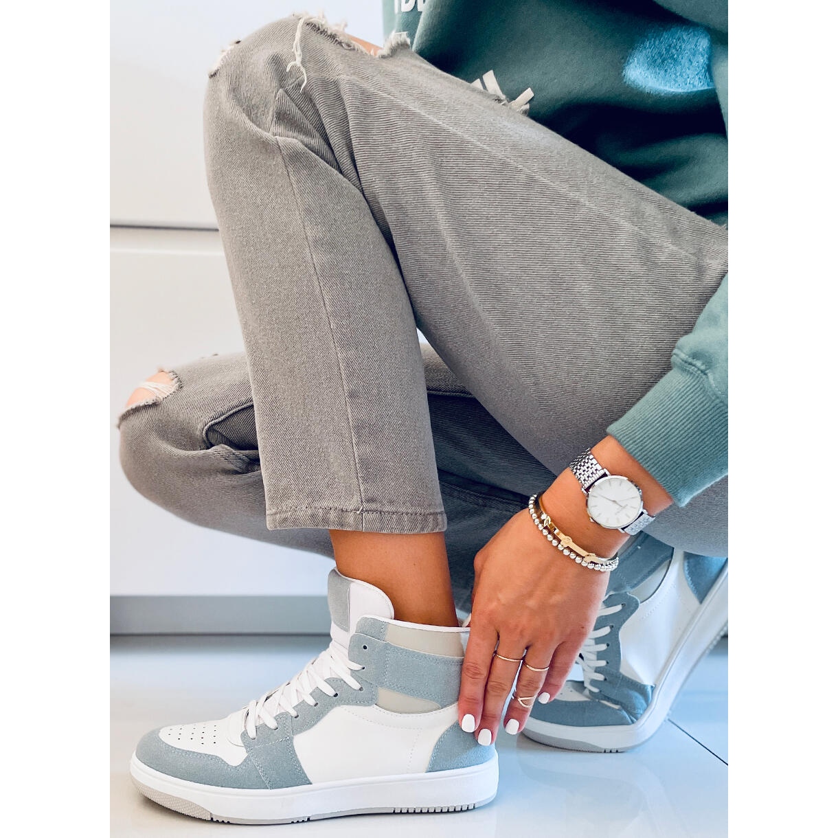 Nous vous présentons les baskets montantes Dorcas Green uniques en blanc et bleu du fabricant PA1, qui correspondent parfaitement aux tendances de ce printemps et de cet été ! Ces chaussures à lacets sont non seulement un ajout accrocheur au style quotidien, mais aussi des chaussures confortables conçues pour les femmes actives.