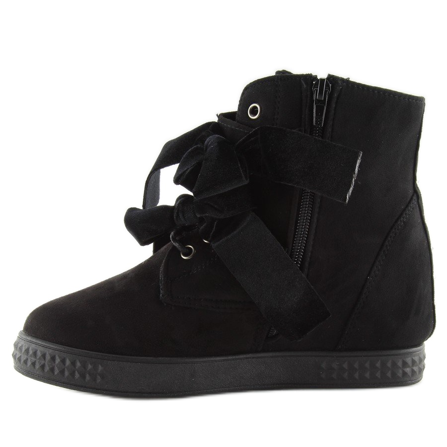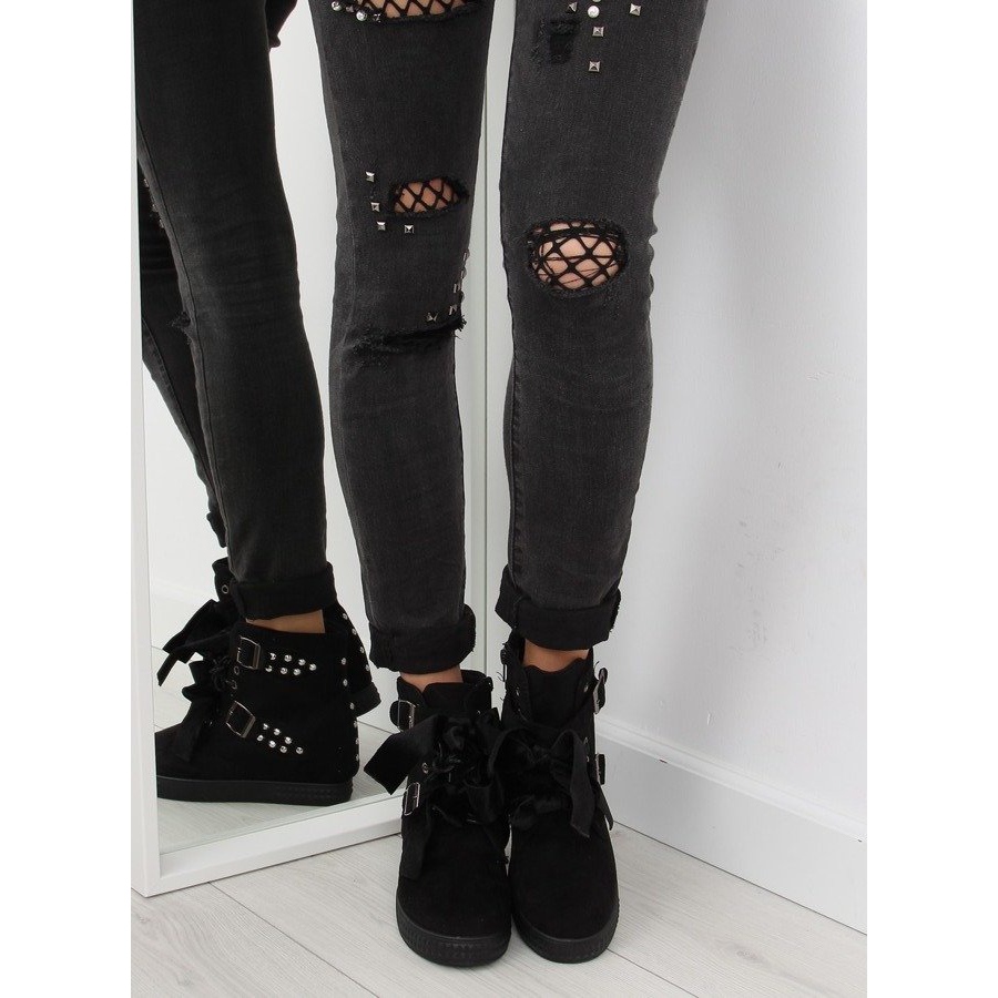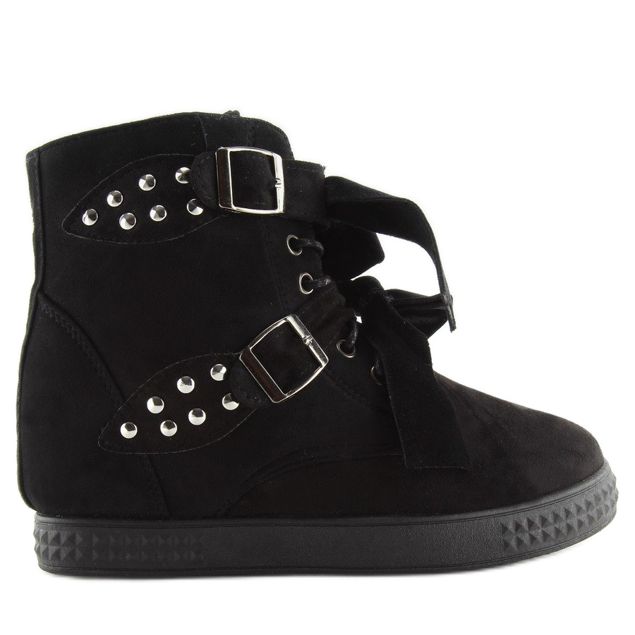 Nous vous présentons les magnifiques baskets pour femmes A-79 de couleur noire, qui allient parfaitement style et confort. Ces baskets uniques avec une cale cachée, de 7 cm de hauteur, attirent l'attention par leur design original. La finition en daim noir et les clous décoratifs argentés ajoutent du caractère, tandis que les nœuds en velours ajoutent une touche d'élégance.