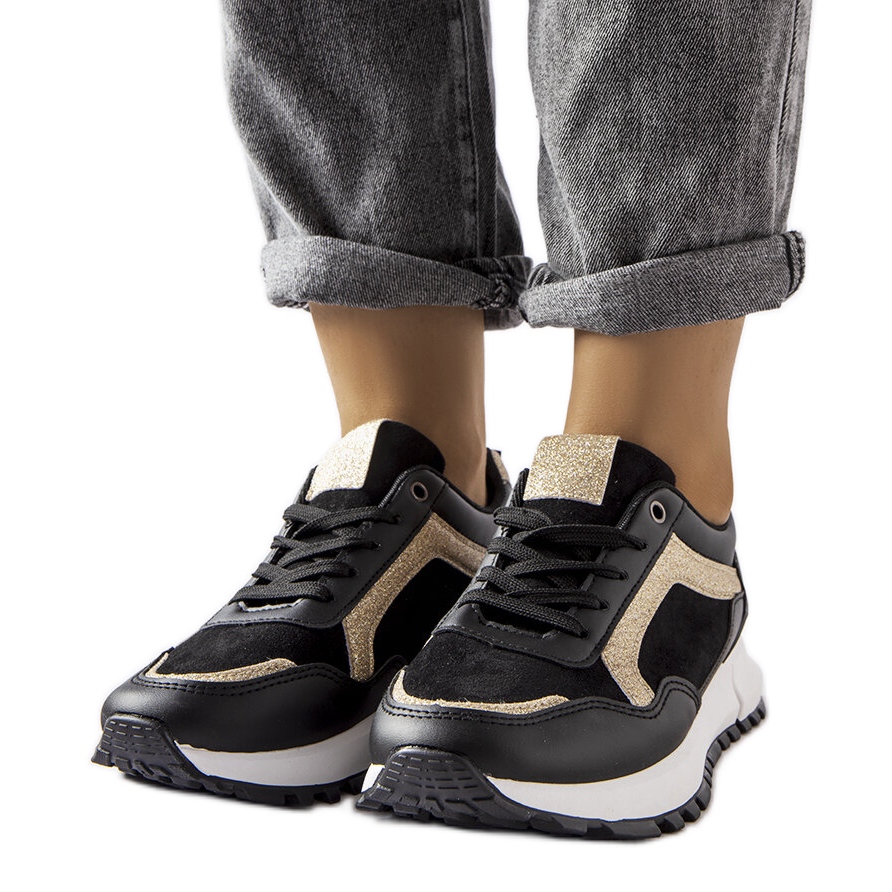 Une autre baskets noires avec décoration paillette de Busso - style et confort en une. Un tige en cuir écologique noir classique et des accents dorés subtils des paillettes donnent aux chaussures un caractère élégant du soir, et le nez d'amande leur donne la légèreté et la subtilité féminine.