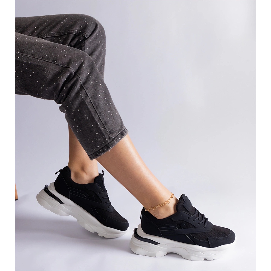 Nous présentons des baskets noires sur une semelle plus épaisse qui combine le style, le confort et le design moderne. Un excellent choix pour les femmes actives qui apprécient à la fois l'apparence à la mode et le confort lors des activités quotidiennes.