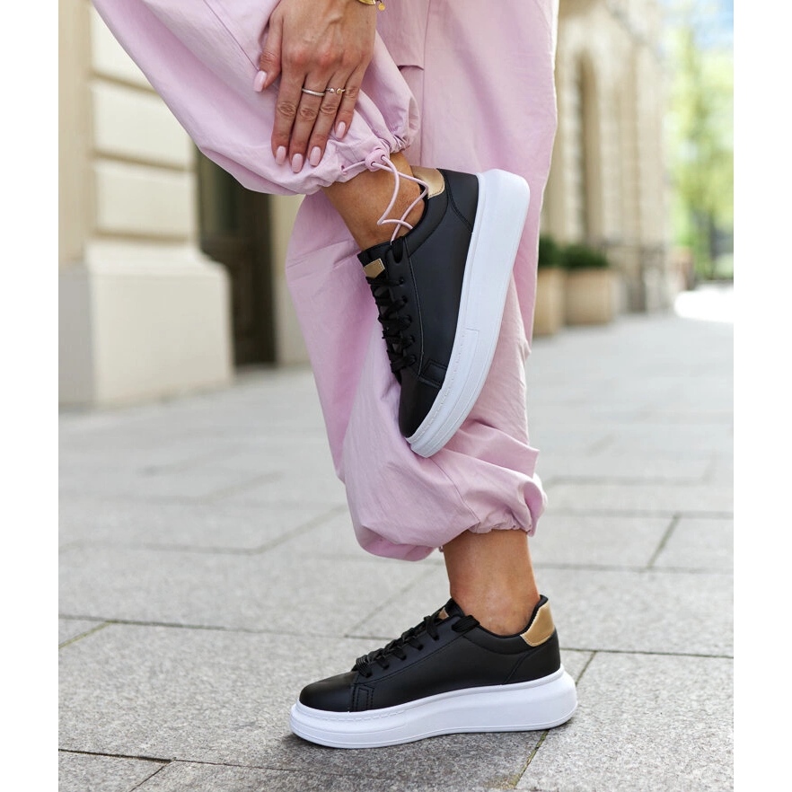 Leur design innovant attirera certainement les looks - la semelle blanche contraste avec la couleur noire classique, qui est complétée par de délicats accents dorés. Ces baskets sont un excellent choix pour de nombreux styles - ils sont parfaits pour les tenues décontractées et plus élégantes.