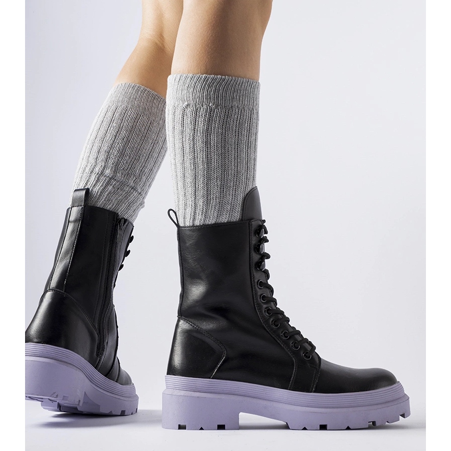 Les baskets noires à semelle colorée sont des chaussures pour femmes extrêmement stylées et isolées, parfaites pour l'hiver. Elles sont fabriquées en cuir écologique et la semelle est en caoutchouc de haute qualité, ce qui se traduit par leur durabilité et leur confort de port. Les chaussures sont entièrement noires, à l'exception de la semelle violette. Elles ont un talon plat de 4 cm de haut et le tout arrive au-dessus de la cheville.