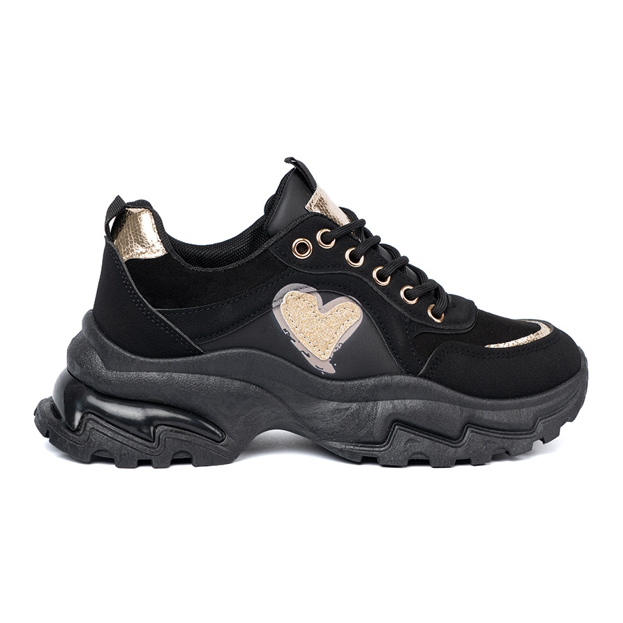 Adaptés à une variété de stylifications, les baskets noires Shelvt avec un cœur doré décoratif se fondreont parfaitement dans le sport et le look de la mode. Leur emballage d'origine en fait également une excellente idée cadeau.