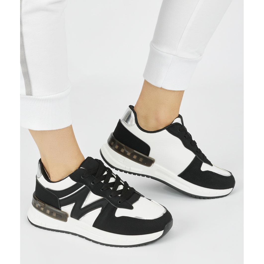 Nous présentons des baskets en noir et blanc aux femmes à la mode et confortables d'une marque réputée, qui sera excellente dans les stylisations de tous les jours et pendant les activités sportives. Ces chaussures de sport combinent le design et le réconfort modernes que chaque femme apprécie.