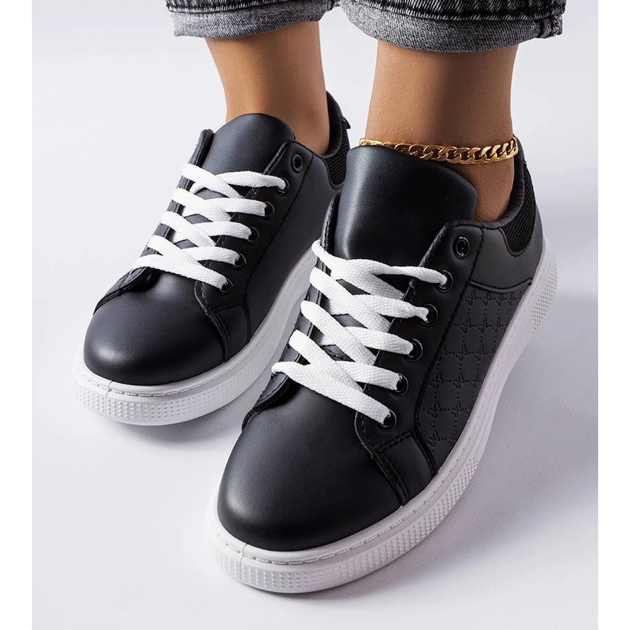 Sneakers noirs avec en relâchement Dreux - élégant, confortable et universel. Une tige en cuir écologique lisse a été variée avec un talon décoratif et une pression subtile à l'extérieur de la chaussure. Le noir classique avec une semelle blanche contrastée signifie que le modèle correspond à la fois en jean et en robes d'été ou en jupes maxi - en été, il mettra en avant le bronzage.