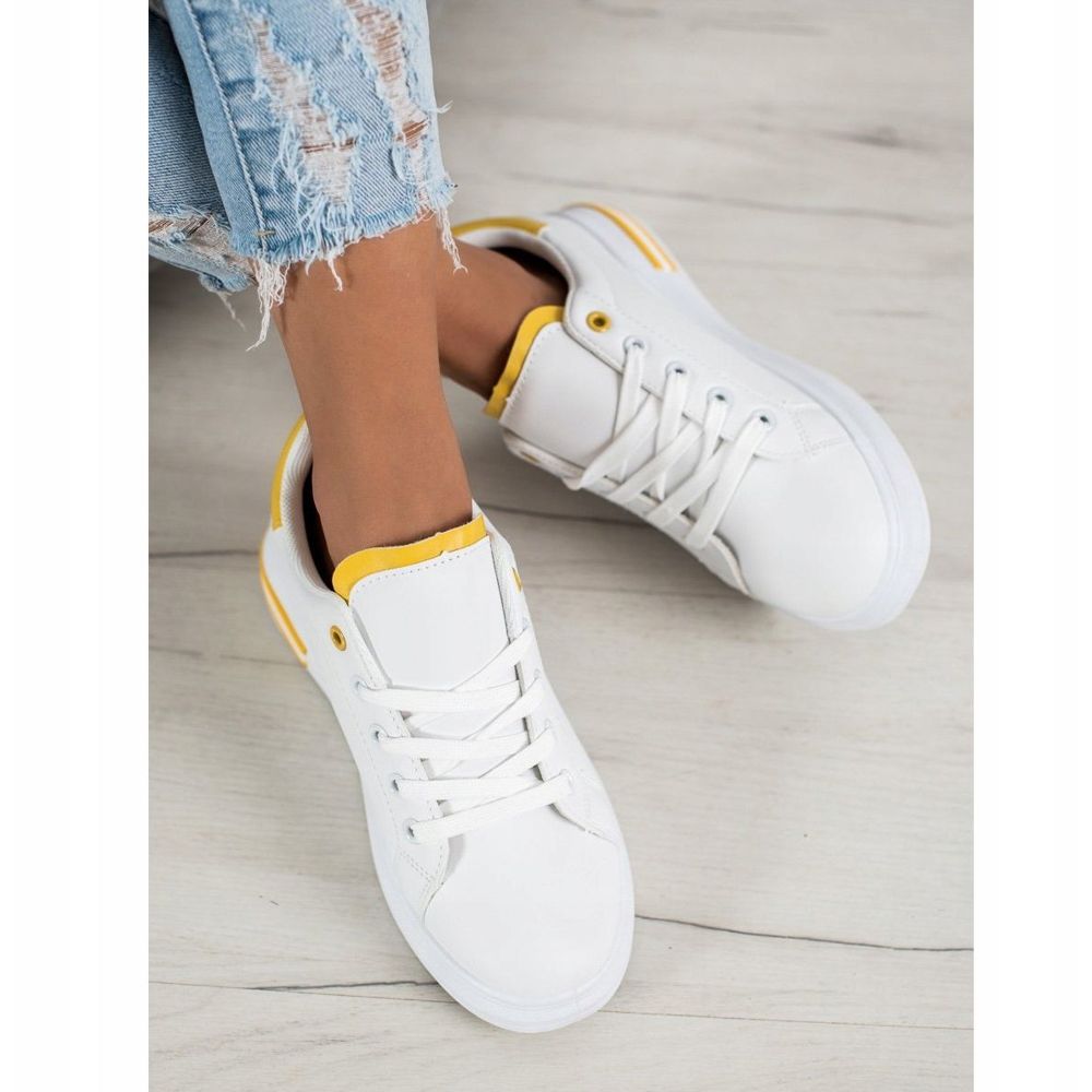 Découvrez l'élégance et le confort à chaque pas avec les baskets SHELOVET blanches et jaunes. Ces chaussures pour femmes à la mode avec une plateforme de 3,5 centimètres combinées à des rayures décoratives jaunes à l'arrière créent un look unique et élégant qui sera parfait aussi bien pour les styles quotidiens que plus décontractés.