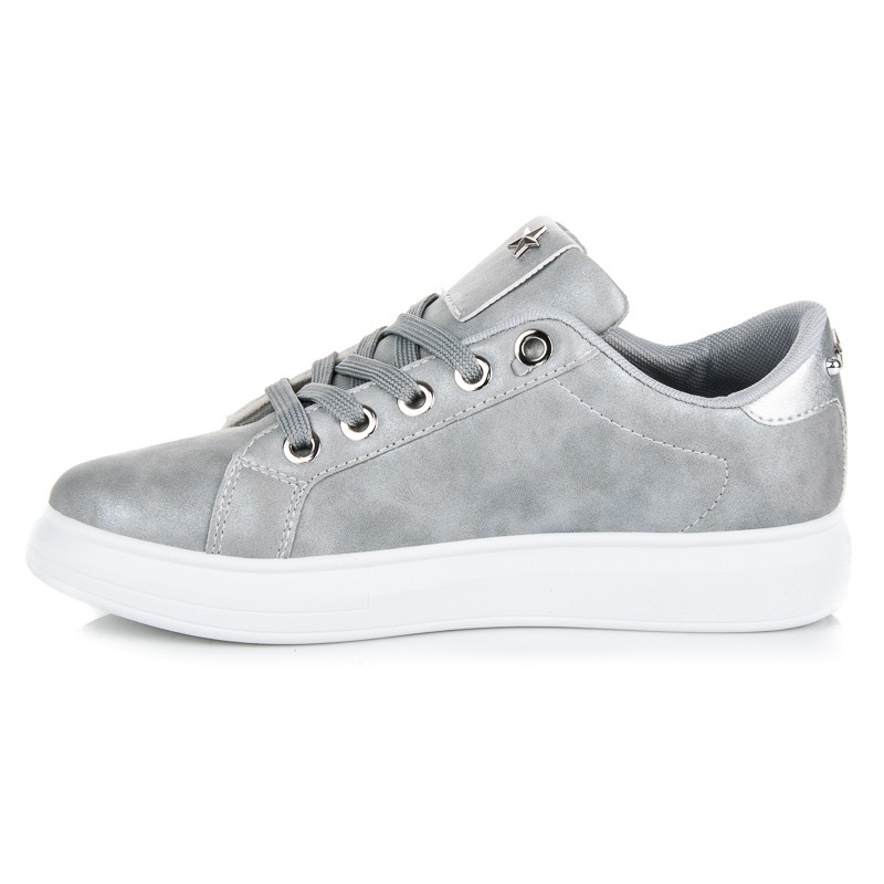 Fabriquées en éco-cuir, ces baskets grises sont à la fois élégantes et pratiques. Le matériau de la semelle intérieure en tissu offre un confort supplémentaire à chaque pas. Un avantage supplémentaire sont les strass qui donnent aux chaussures un peu de brillance et un caractère unique.