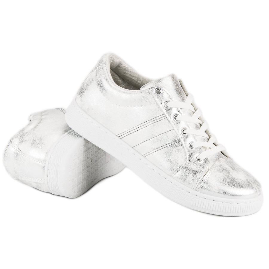 Leur construction solide comprend une semelle en caoutchouc avec bande de roulement, qui garantit une excellente adhérence et stabilité, ainsi qu'un confort de port. Grâce au profil abaissé et à la plateforme de 2 cm de hauteur, ces chaussures offrent un soutien adéquat aux pieds, et le bout rond leur ajoute de la légèreté. Les baskets argentées sont nouées à l'aide de lacets blancs traditionnels, ce qui permet un ajustement parfait au pied.