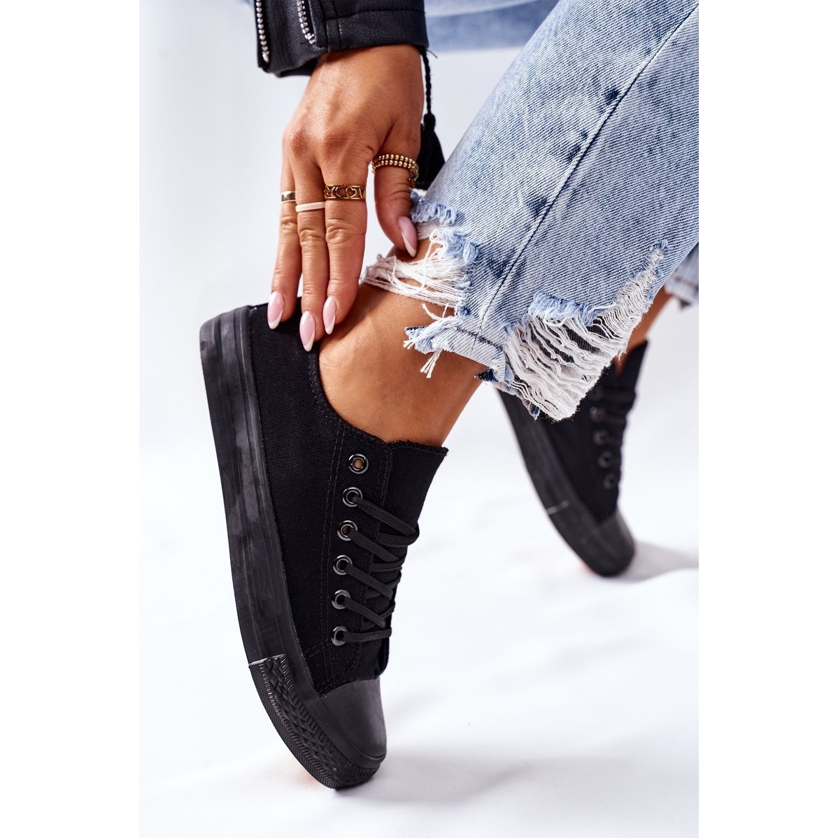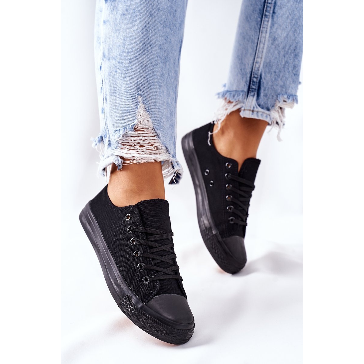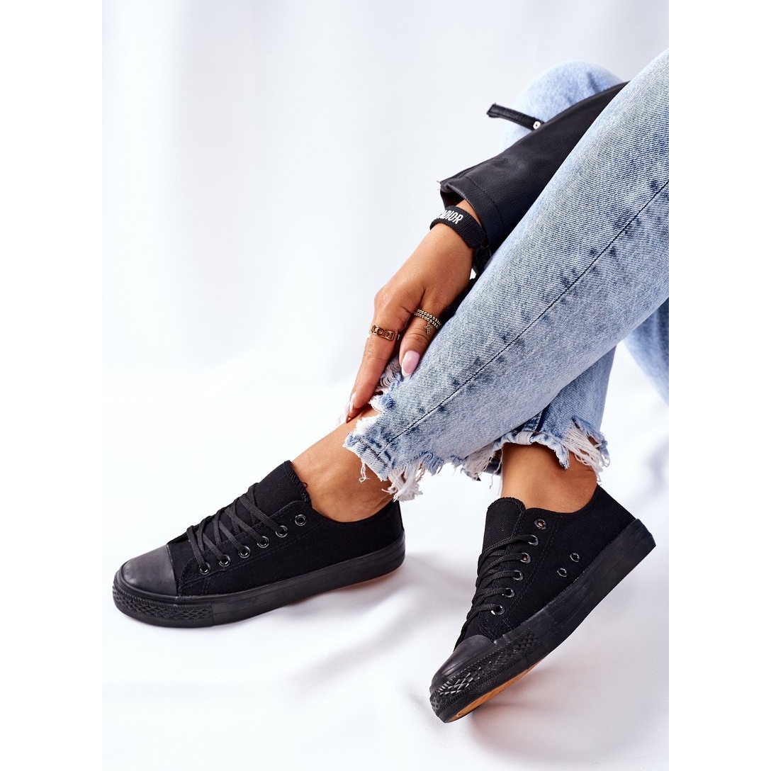 Les baskets noires Omerta sont fabriquées en tissu - à la fois le matériau extérieur et la semelle intérieure. Les chaussures se caractérisent par une construction basse, avec un bout rond et sans isolation. Le talon est plat et la hauteur de la semelle est de 2 cm. La hauteur supérieure est de 5,5 cm. Le design pur domine, sans motifs supplémentaires.