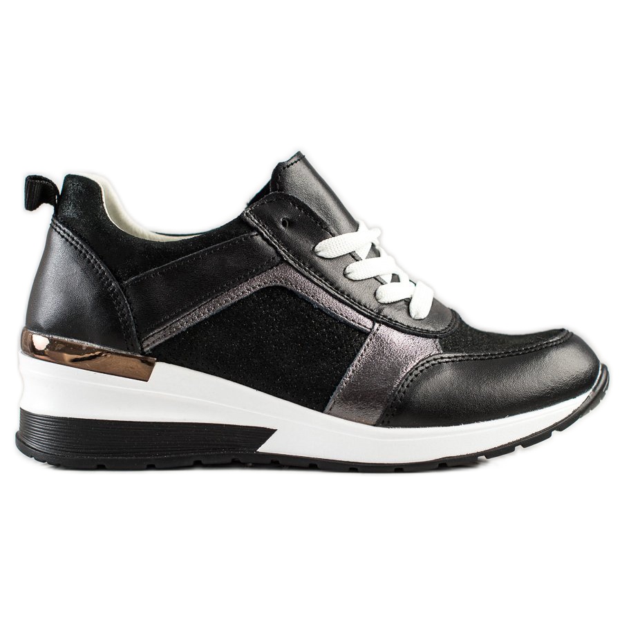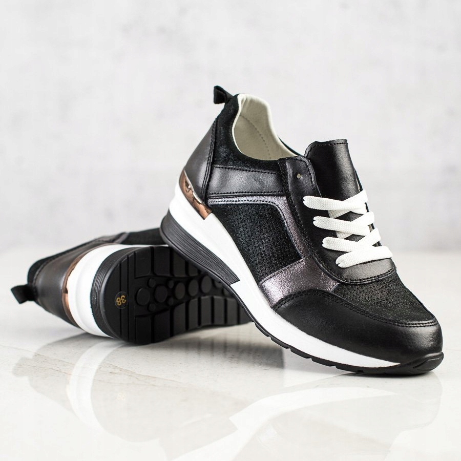 La tige est en cuir écologique noir de haute qualité, ce qui garantit durabilité et look élégant. Les empiècements recouverts de paillettes sont un accent inhabituel, qui ajoutent une brillance subtile aux baskets. Le bout rond et le talon souple intégré assurent un port confortable, tandis que la semelle profilée en matière synthétique garantit une bonne adhérence et une bonne stabilité sur toutes les surfaces.
