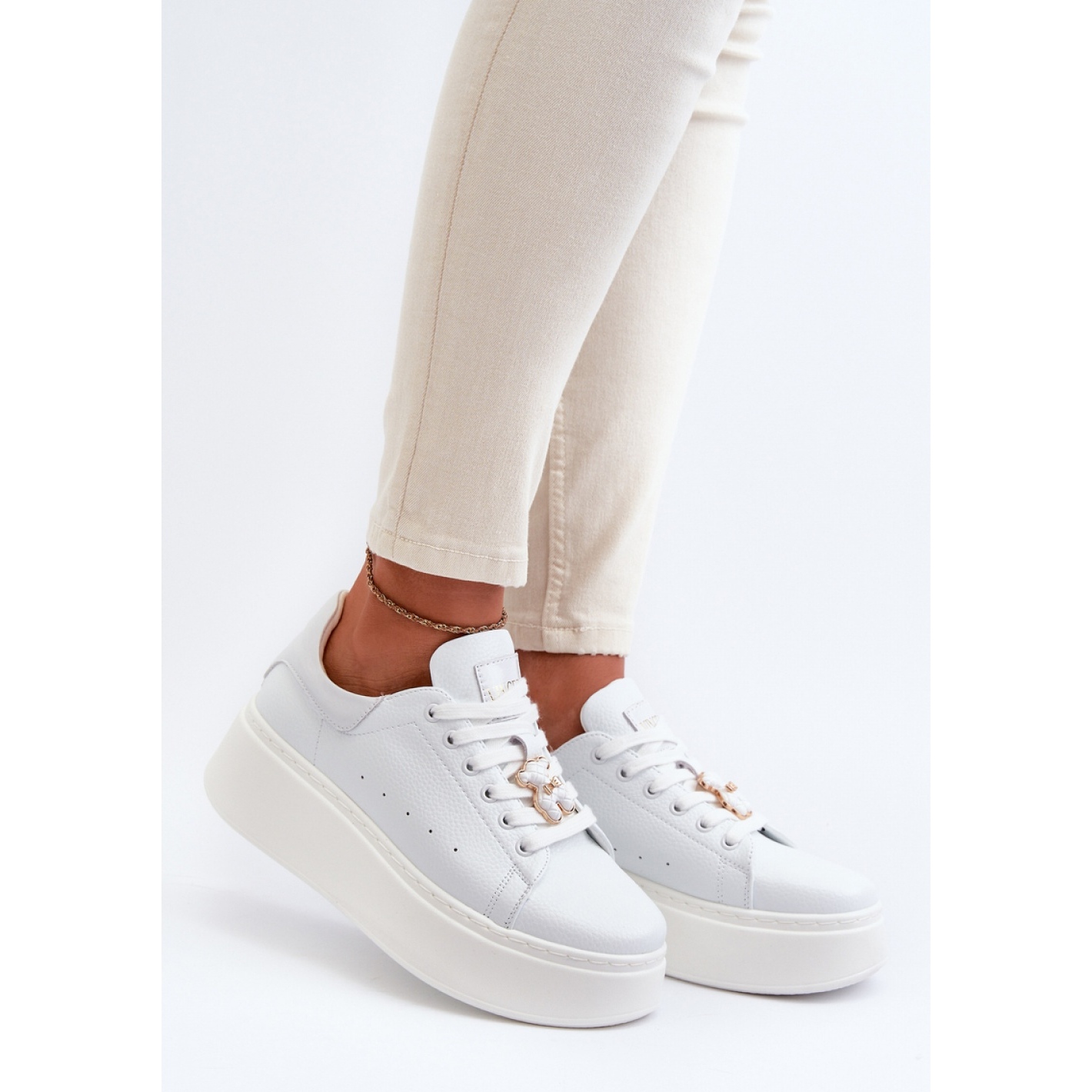La plate-forme supérieure de 6,5 cm et une plate-forme massive de 4,5 cm de haut ajoute non seulement la légèreté, mais aussi allonger optiquement les jambes, ce que chaque femme appréciera certainement. De plus, le laçage décoratif avec un charmant motif d'ours en peluche fait ressortir les baskets des autres modèles, leur donnant un caractère inhabituel.