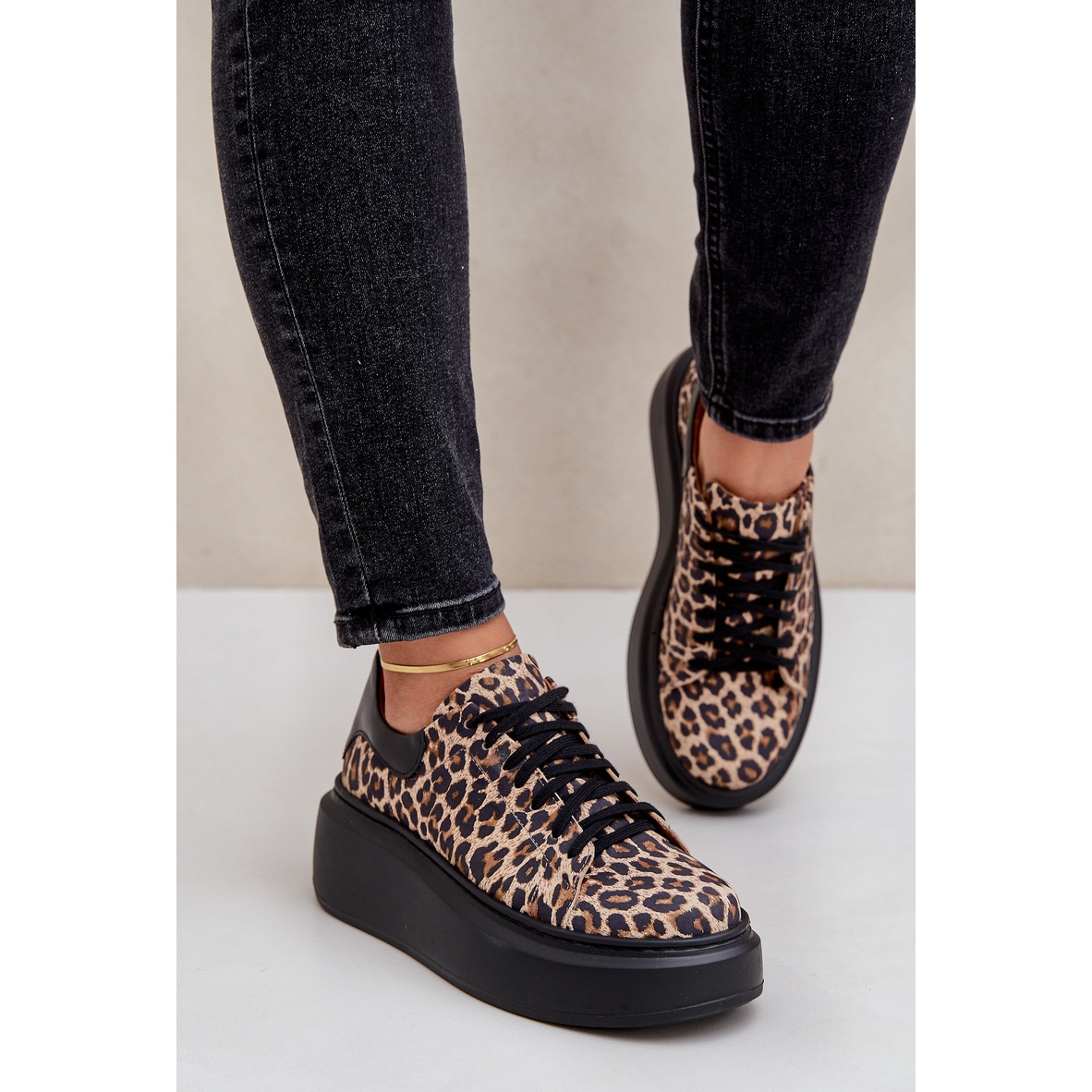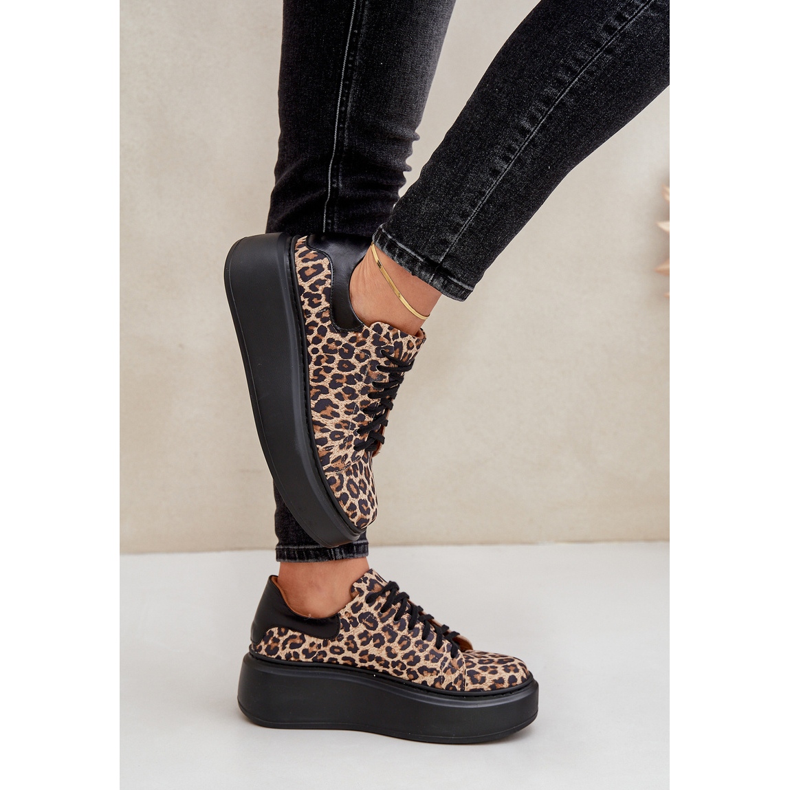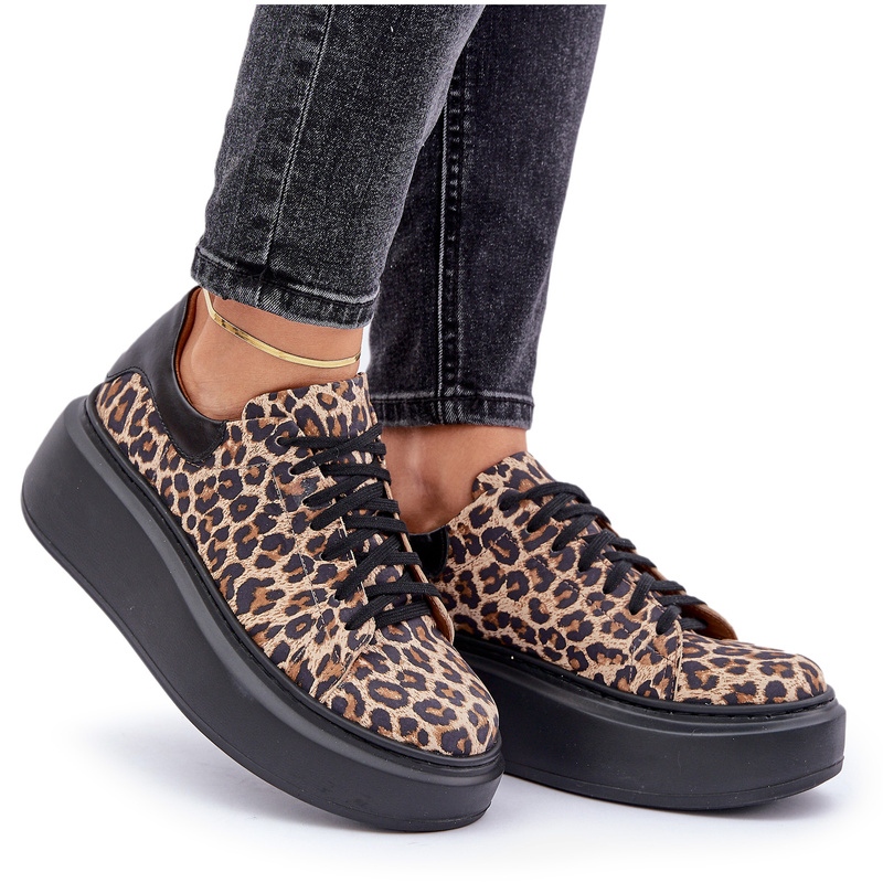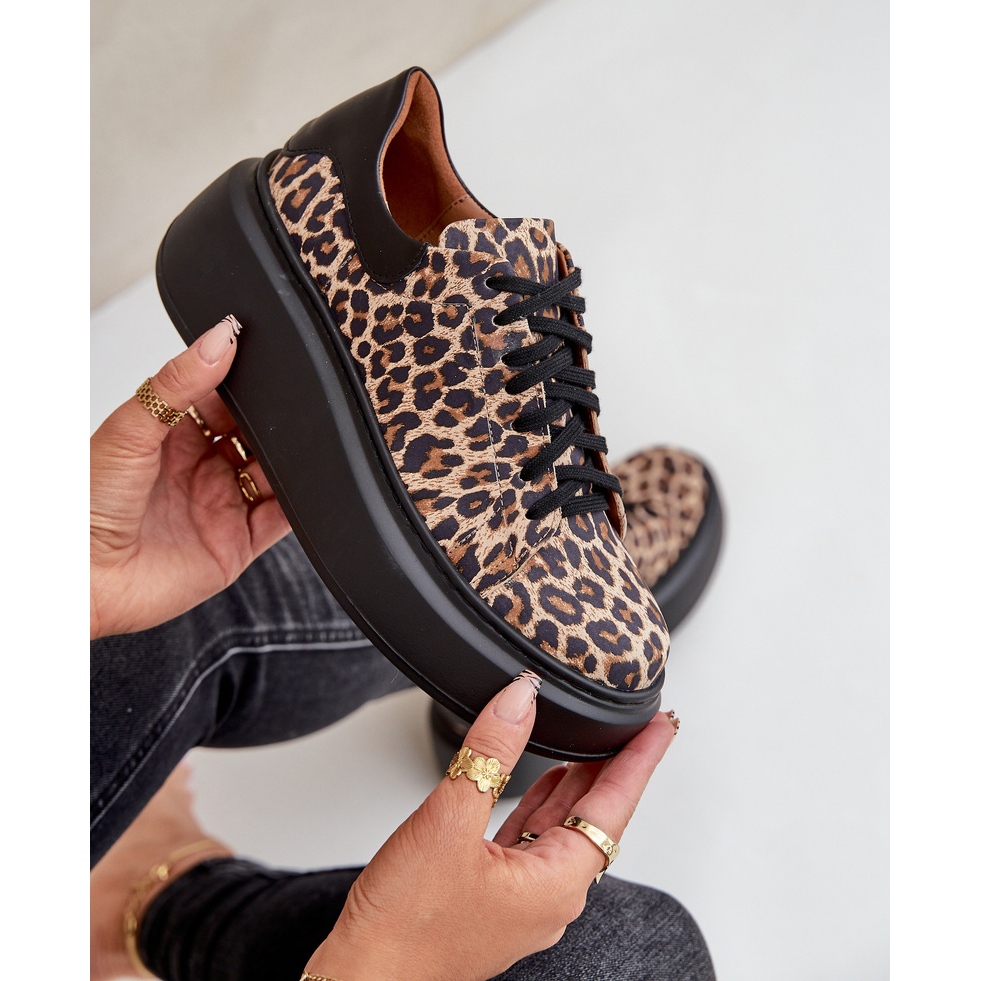 Situé sur une plate-forme de 6 cm de haut, ils ajoutent un peu de hauteur, ce qui rend les jambes plus minces et plus longues. Leur nez arrondi et un fermoir en dentelle garantissent un ajustement parfait au pied. Le motif d'imprimé léopard dans les nuances de brun et de noir donne un caractère prédateur, ce qui en fait une excellente proposition de stylisations urbaines décontractées.