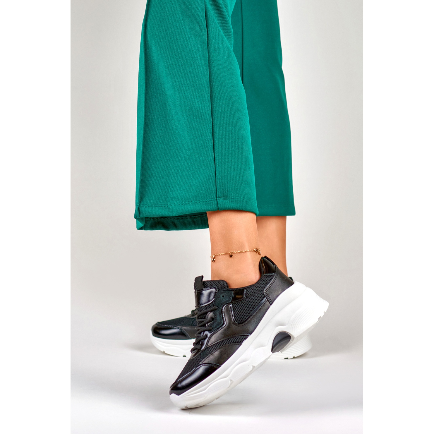 Ces chaussures noires pour femme sont signées Inna Marka et appartiennent à la collection KeeShoes. Ces chaussures sont des baskets de sport élégantes, particulièrement populaires au printemps/été. Ils se caractérisent par une construction basse et un nez rond. Ils sont équipés d'une plateforme de 6 cm de hauteur, ce qui les rend plus confortables à porter.