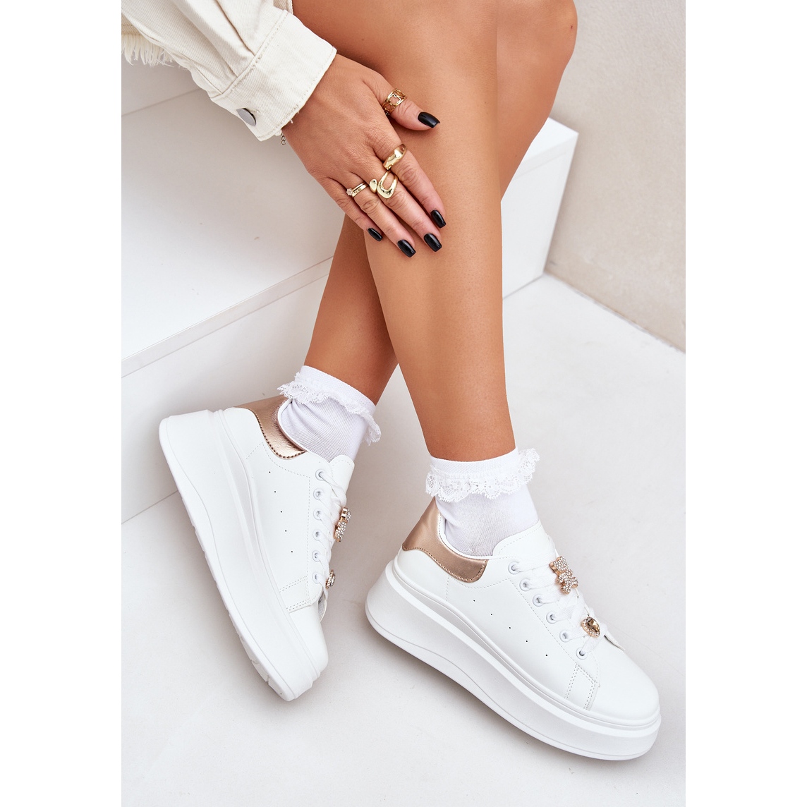 Parfait à la fois au quotidien et aux réunions occasionnelles, ces baskets seront un complément parfait à toute stylisation. Leur couleur blanche, combinée à de délicats accessoires dorés, ajoutera la légèreté et la fraîcheur à chaque garde-robe.