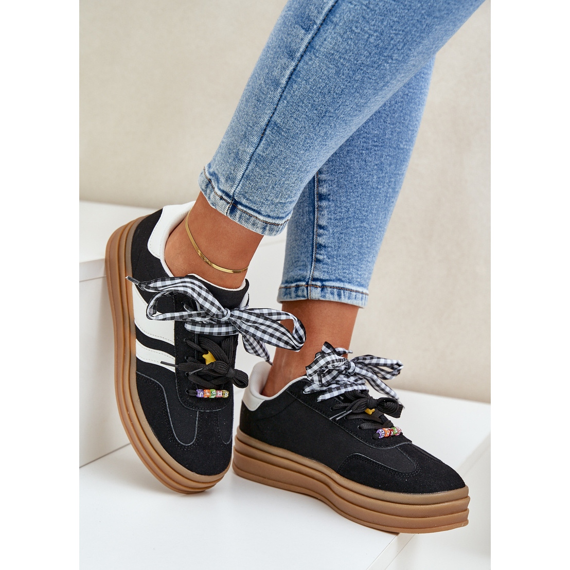 Ces baskets élégantes intégrées sur une plate-forme de 3,5 cm de haut soulignent magnifiquement la figure, ajoutant quelques centimètres de haut. Leur design moderne les rend parfaitement adaptés aux dernières tendances. Des épingles charmantes, qui sont un élément décoratif supplémentaire, introduisent le charme et l'originalité des filles, faisant des chaussures un accent inhabituel de toute stylisation.