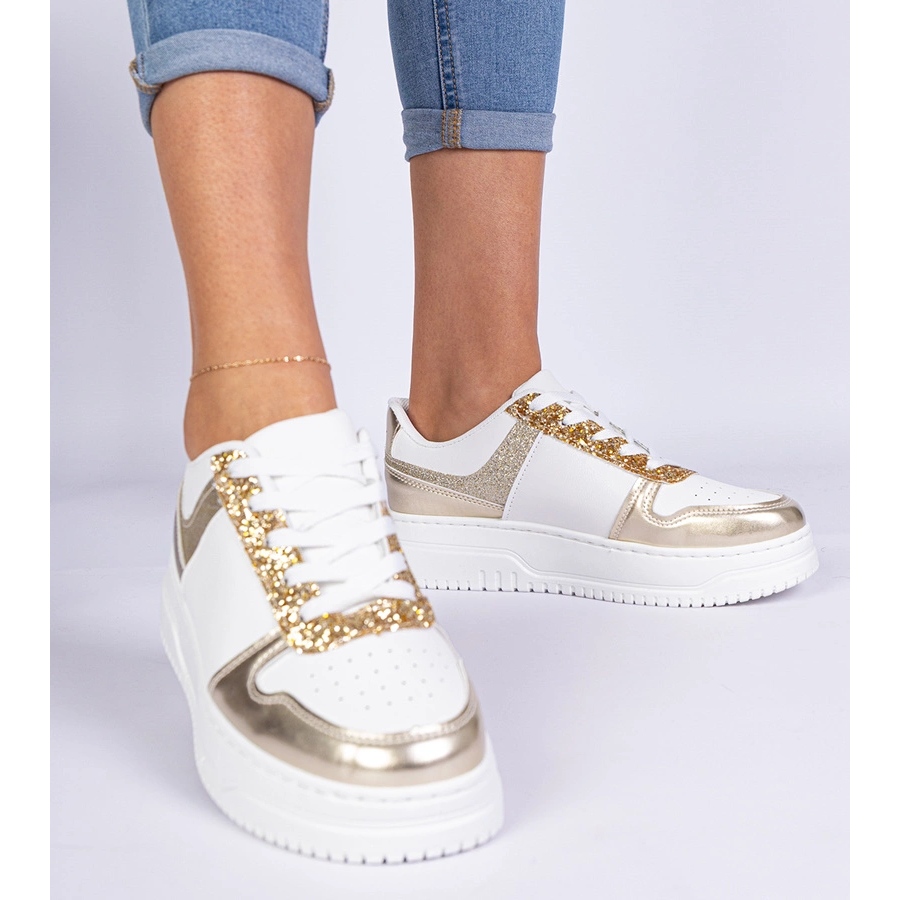 Baskets pour femmes dorées sur une semelle épaisse décorée de paillettes