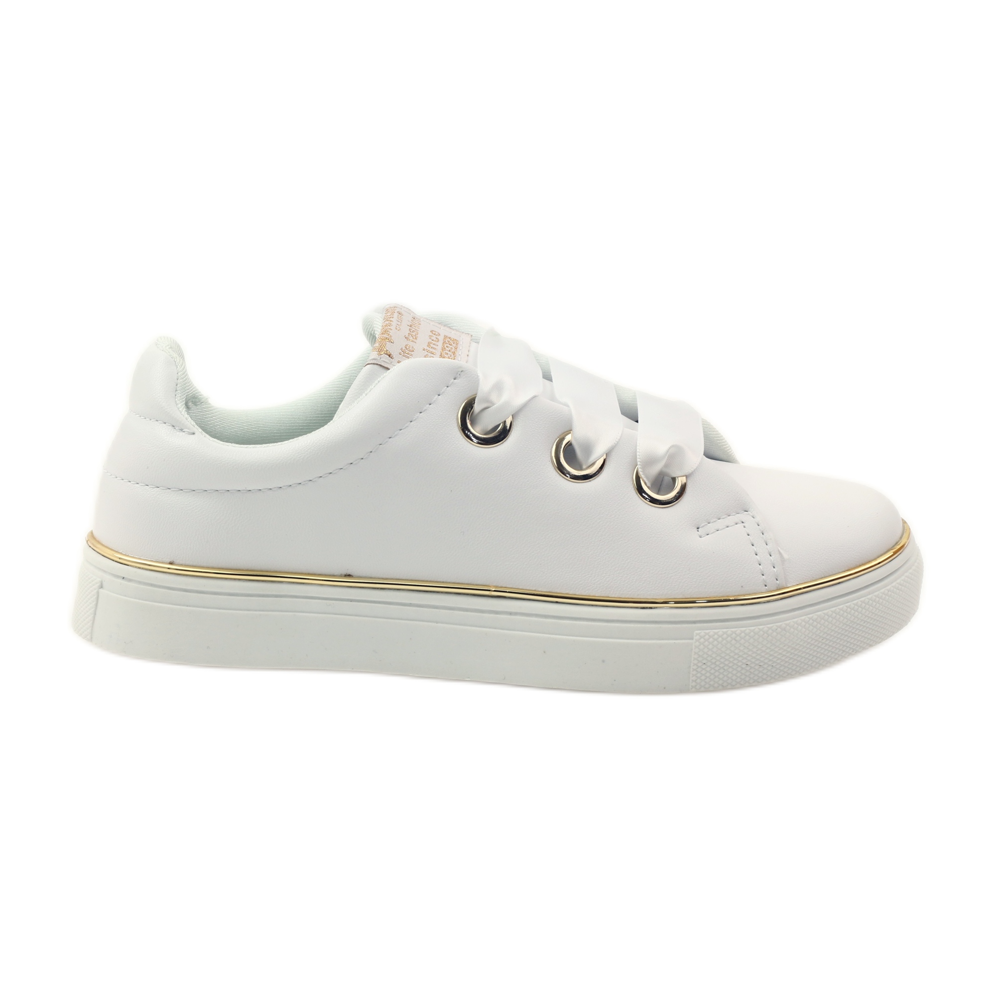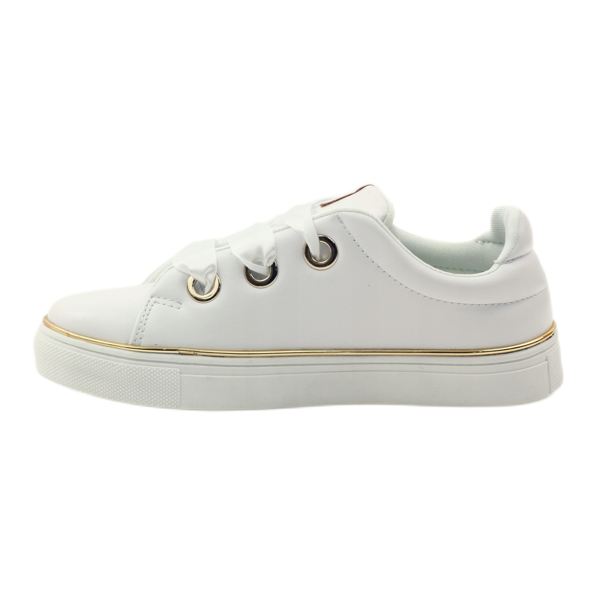Des baskets élégantes dans une version classique et féminine. Le modèle 17152 est fabriqué en éco-cuir blanc de haute qualité, décoré d'un passepoil doré autour de la semelle et d'un ruban de satin unique enfilé dans des œillets dorés - un détail subtil qui donne aux chaussures un look chic.