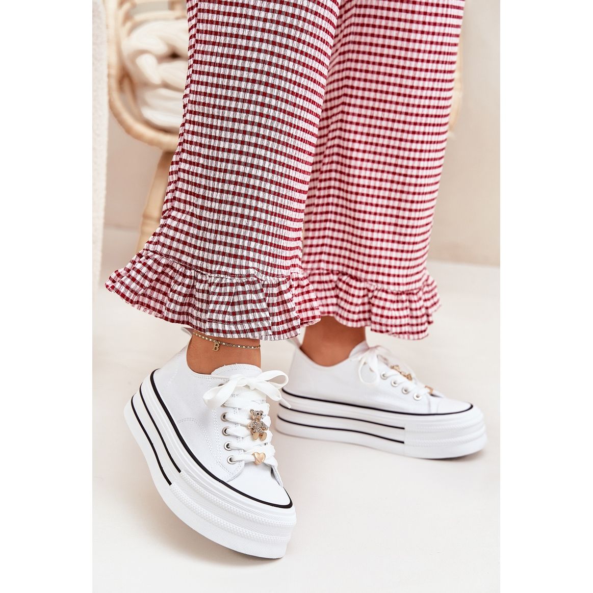 Les baskets pour femmes sur la plate-forme avec des épingles dorées sont une combinaison parfaite de confort et de style, qui fonctionnera dans toute stylisation décontractée. Fabriquées en matériau textile de haute qualité, ces baskets basses sont placées sur une plate-forme solide d'une hauteur de 4,5 cm, ce qui garantit le confort de porter toute la journée. Les épingles dorées leur donnent un accent à la mode, ce qui les rend non seulement pratiques, mais aussi un élément unique de vêtements.