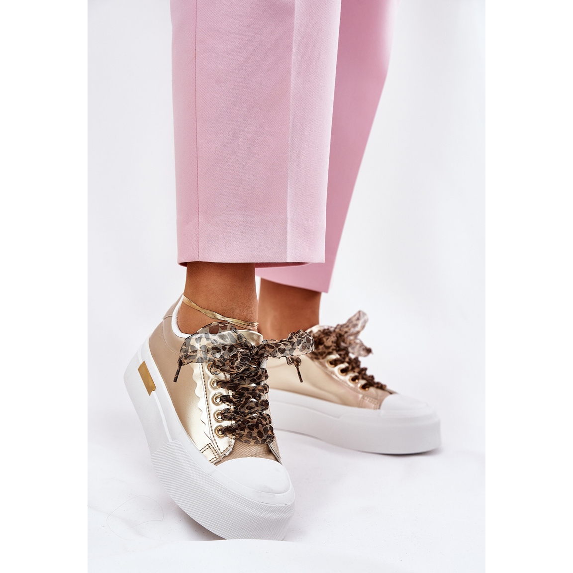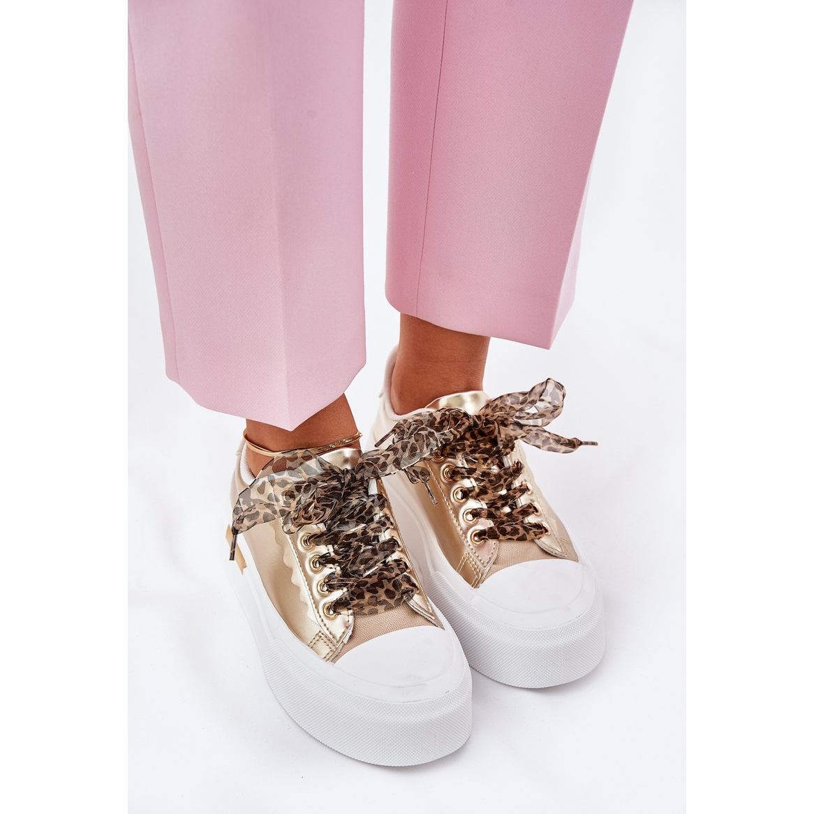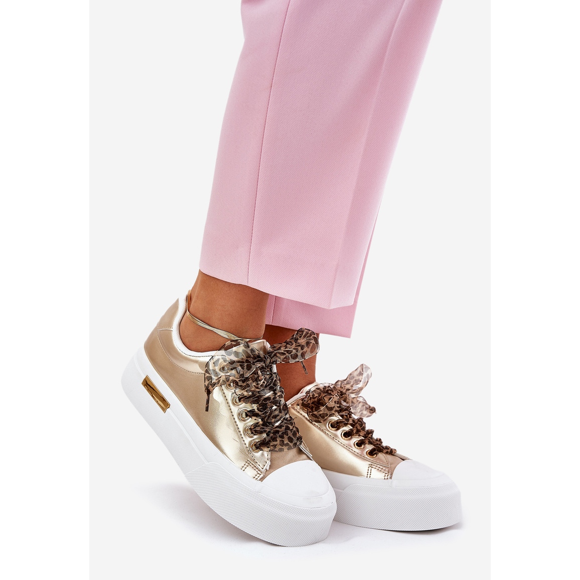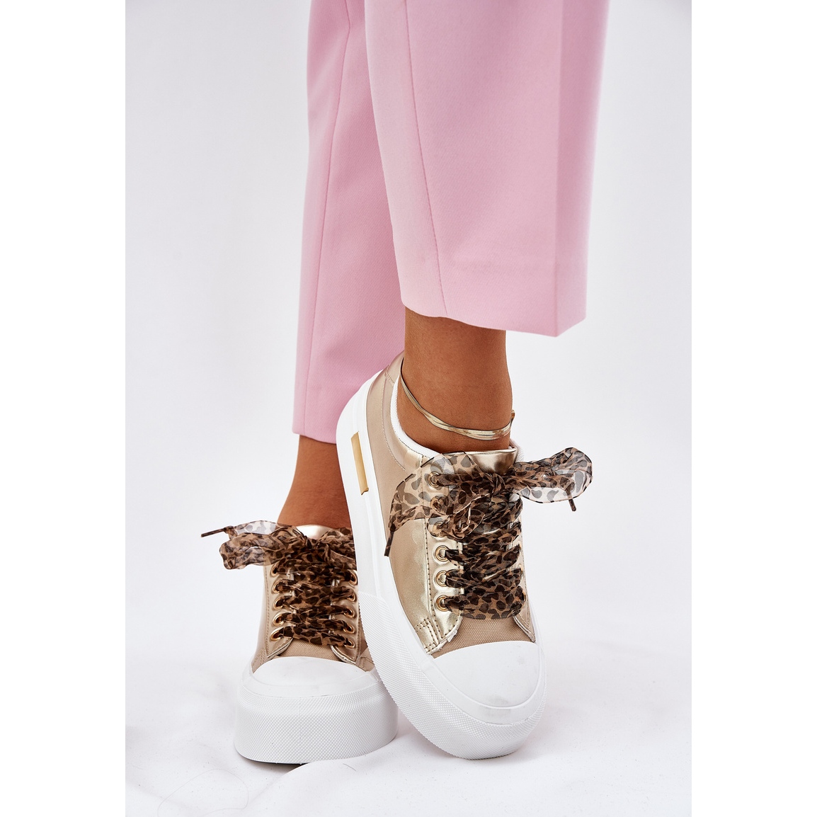 Ne manquez pas l'occasion de terminer votre collection avec ces baskets dorées uniques avec un laçage décoratif! Choisissez le confort et le style à chaque étape!