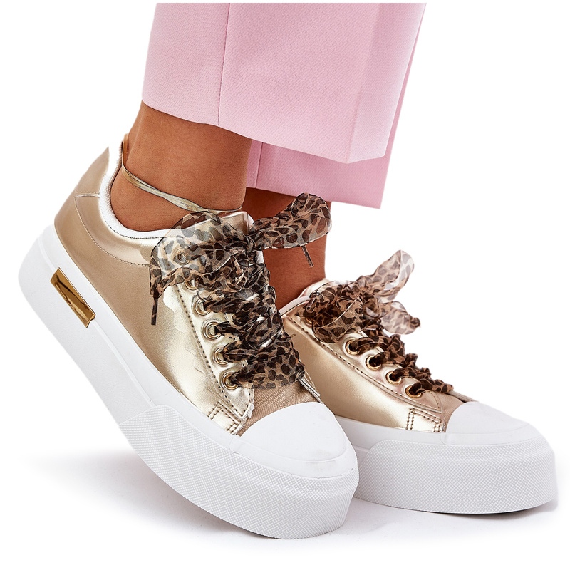 Détails: Baskets pour femmes sur une plate-forme massive avec un laçage décoratif en or d'or