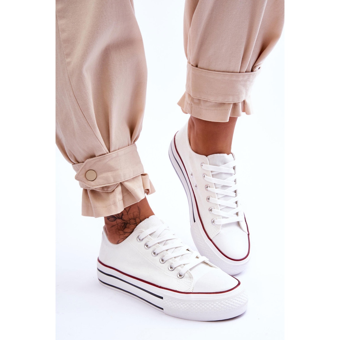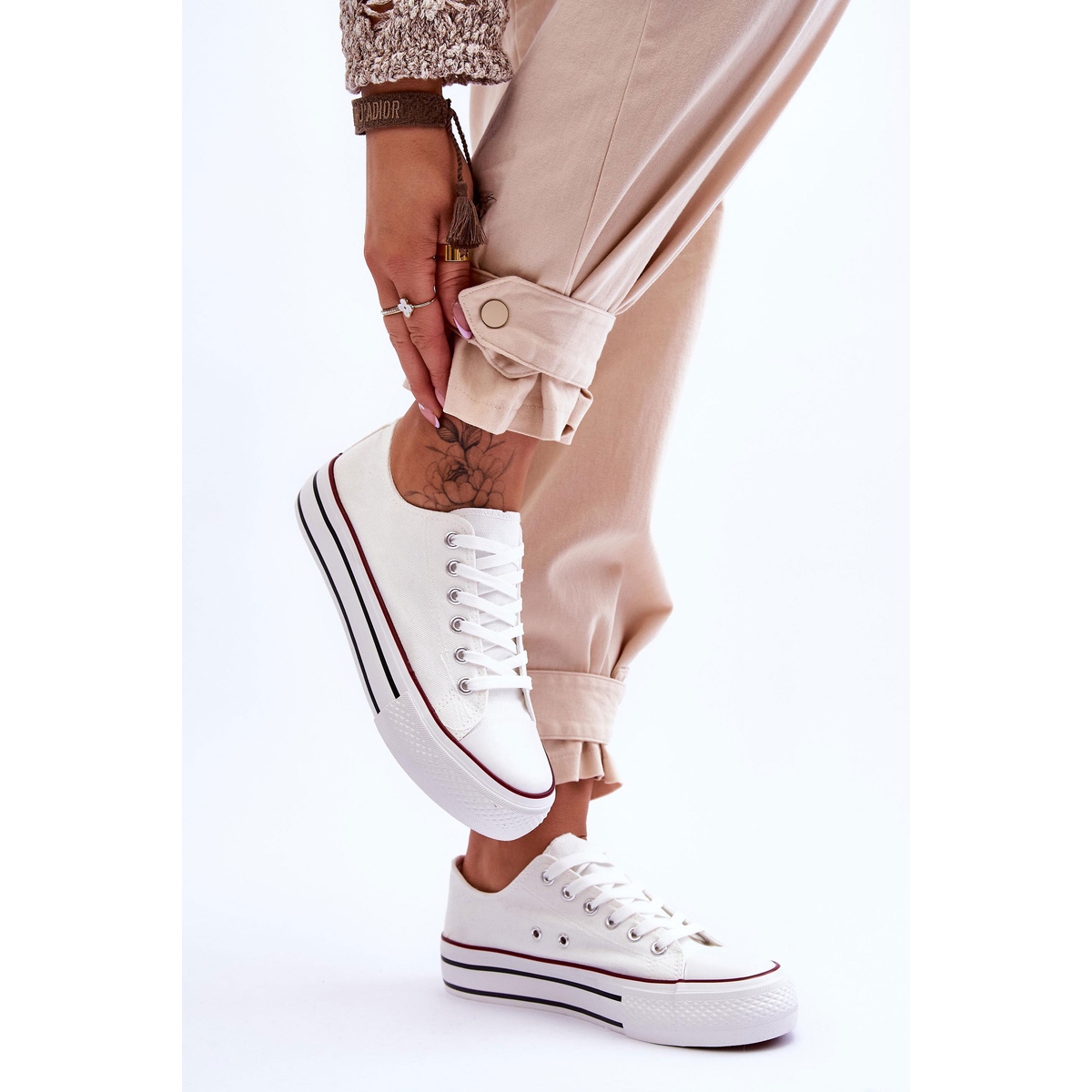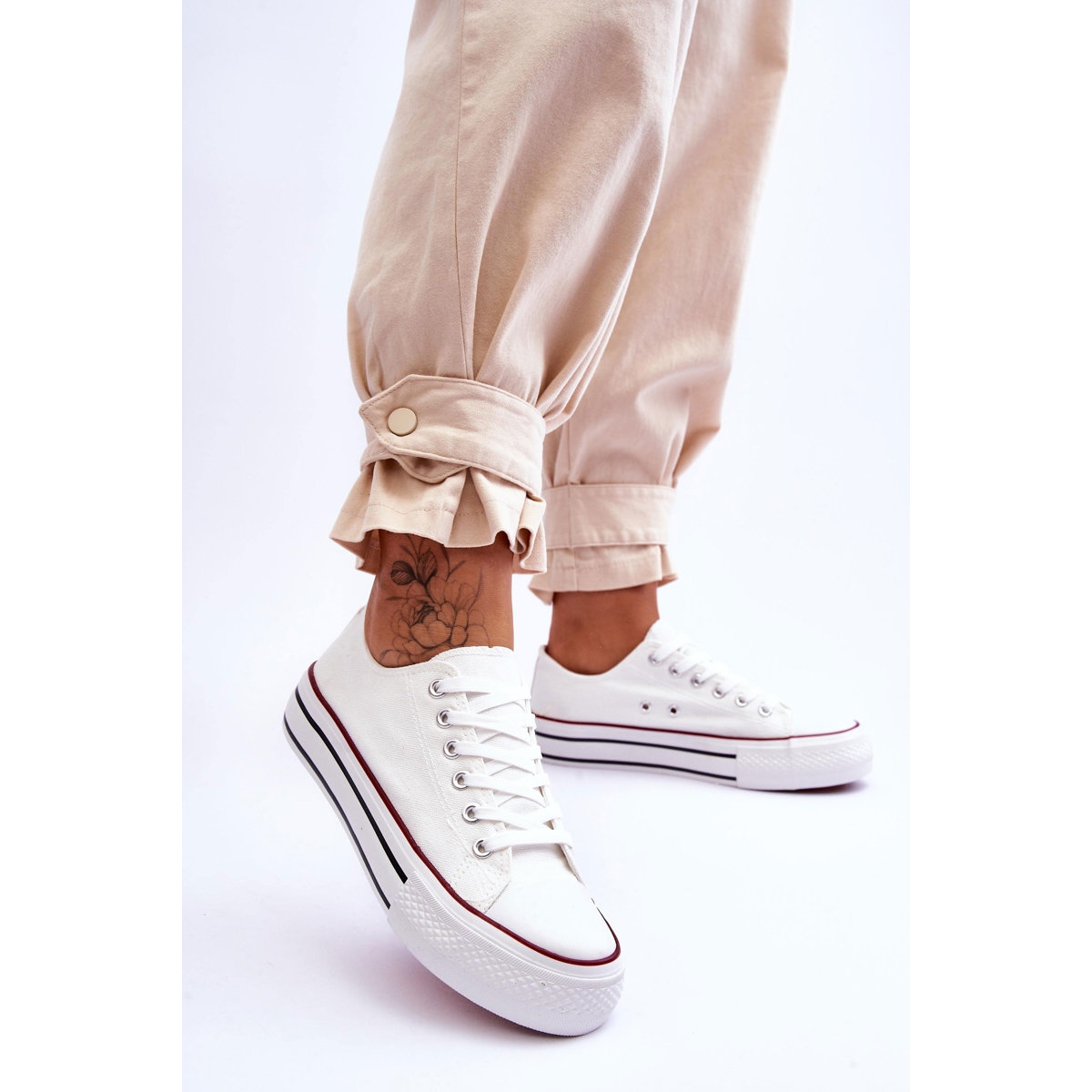 Une plateforme en caoutchouc massive de 2,5 cm de haut et une semelle antidérapante assurent stabilité et sécurité à chaque pas. De plus, le talon légèrement rigidifié soutient la cheville, ce qui augmente le confort d'utilisation. Les baskets se marient parfaitement avec les pantalons et les jupes, vous permettant de créer une variété de styles.