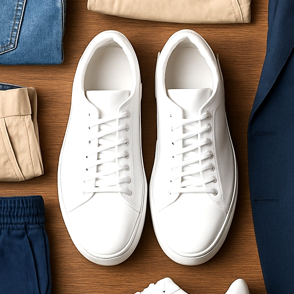C'est la base absolue d'une garde-robe masculine. Les baskets blanches et minimalistes vont avec tout, des jeans aux costumes. Ils sont propres, frais et polyvalents. Incontournables : Adidas Stan Smith blanche, Nike Air Force 1, Common Projects Achilles Low.