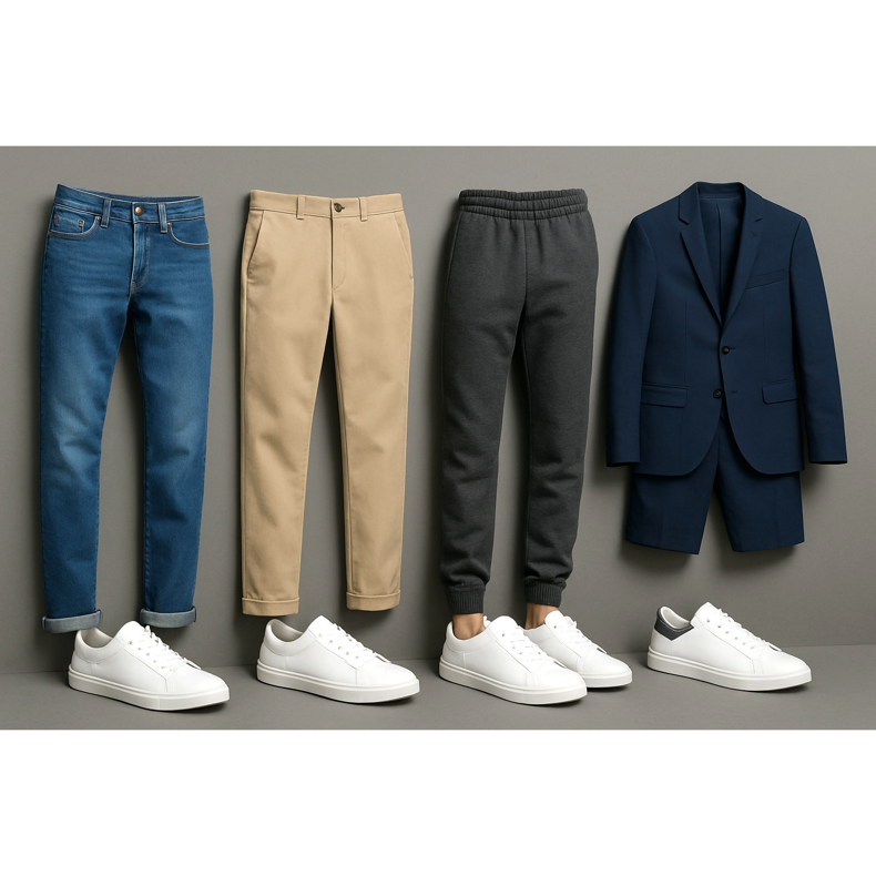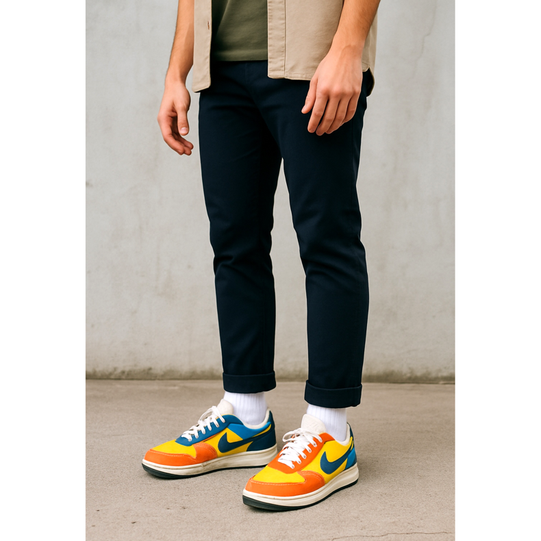 Élégant et confortable, le chino beige, bleu marine ou olive se marie parfaitement avec des baskets minimalistes. Cette combinaison chic et décontractée est parfaite pour le travail et les réunions.