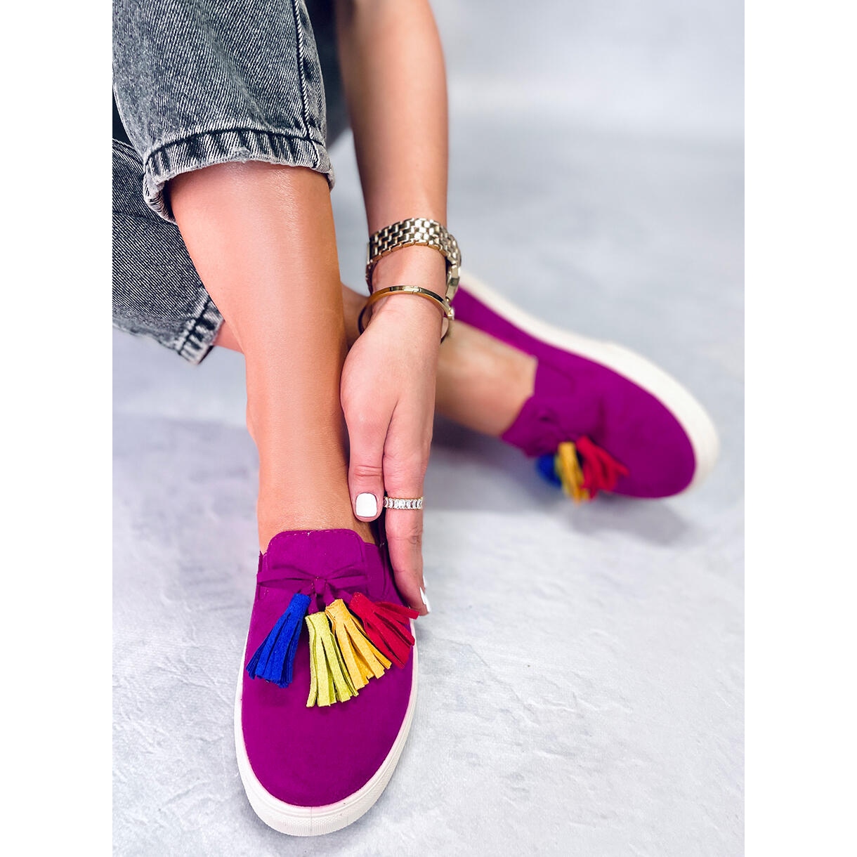 Fabriquée en daim écologique, la sneaker se distingue par sa couleur rose et ses belles franges colorées qui attirent l'attention et ajoutent un caractère unique. Leur intérieur doublé de tissu blanc et d'éco-cuir assure un port confortable tout au long de la journée. Le talon plat et le bout rond garantissent la liberté à chaque pas, et la semelle en caoutchouc rend les baskets durables et résistantes aux dommages.