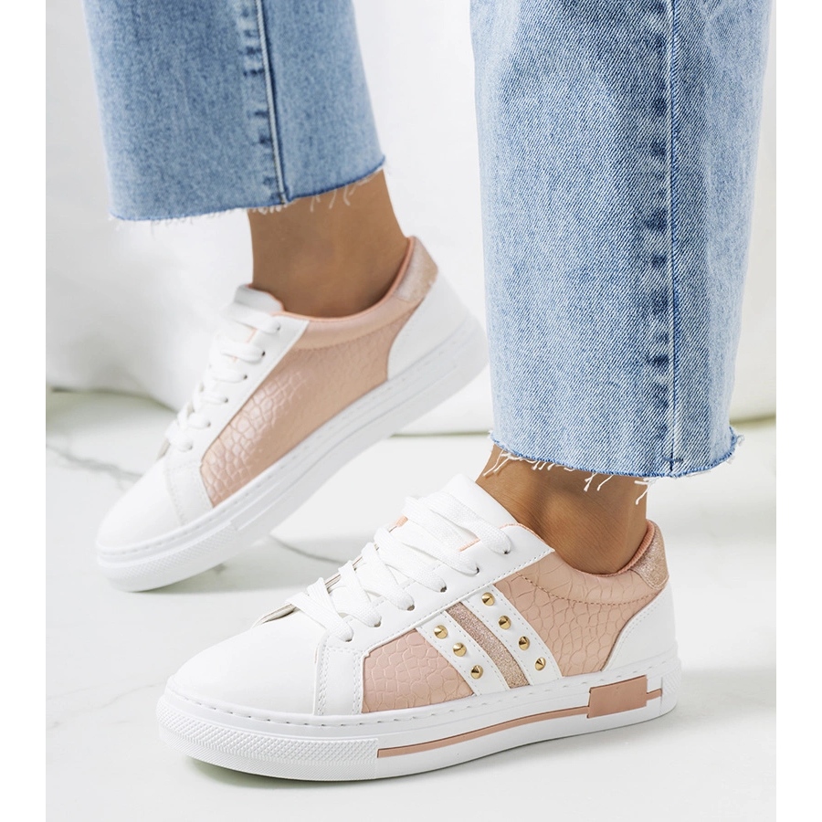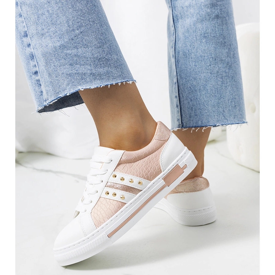 Découvrez un style unique avec des baskets roses à clous blancs ! Ces baskets extrêmement tendance complètent parfaitement vos tenues de tous les jours et attireront tous les regards. Leur design unique se distingue par un élégant motif crocodile, orné de jolis clous et de paillettes argentées. De tels détails confèrent aux chaussures un caractère unique et en font un choix parfait pour toutes les occasions.
