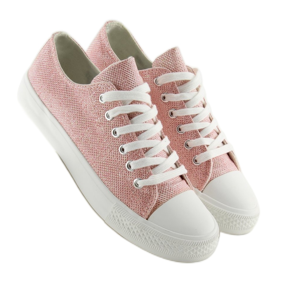 Découvrez les phénoménales baskets pour femmes T-1717 en rose qui ajouteront de l'éclat à votre style de tous les jours ! Fabriquées en tissu brillant avec un fil brillant, ces baskets attireront l'attention et vous démarqueront de la foule.
