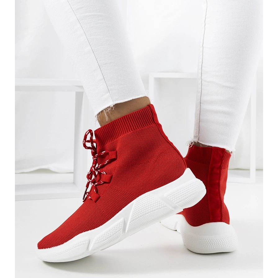 Ces baskets rouges sont une proposition idéale pour les fans de style sportif avec un accent à la mode. La tige sous la forme d'une chaussette flexible atteignant la cheville s'adapte au pied, garantissant le confort. Le modèle est inséré et en même temps équipé de laçage, ce qui vous permet de faire correspondre précisément la chaussure à la jambe. Sole en caoutchouc épais, blanc et rouge, à motifs (hauteur de la plate-forme / talon: 4 cm) ajoute du caractère et offre un bon amorti. Orteil rond, intérieur avec un insert en tissu - non isolés, destiné à des jours plus chauds.