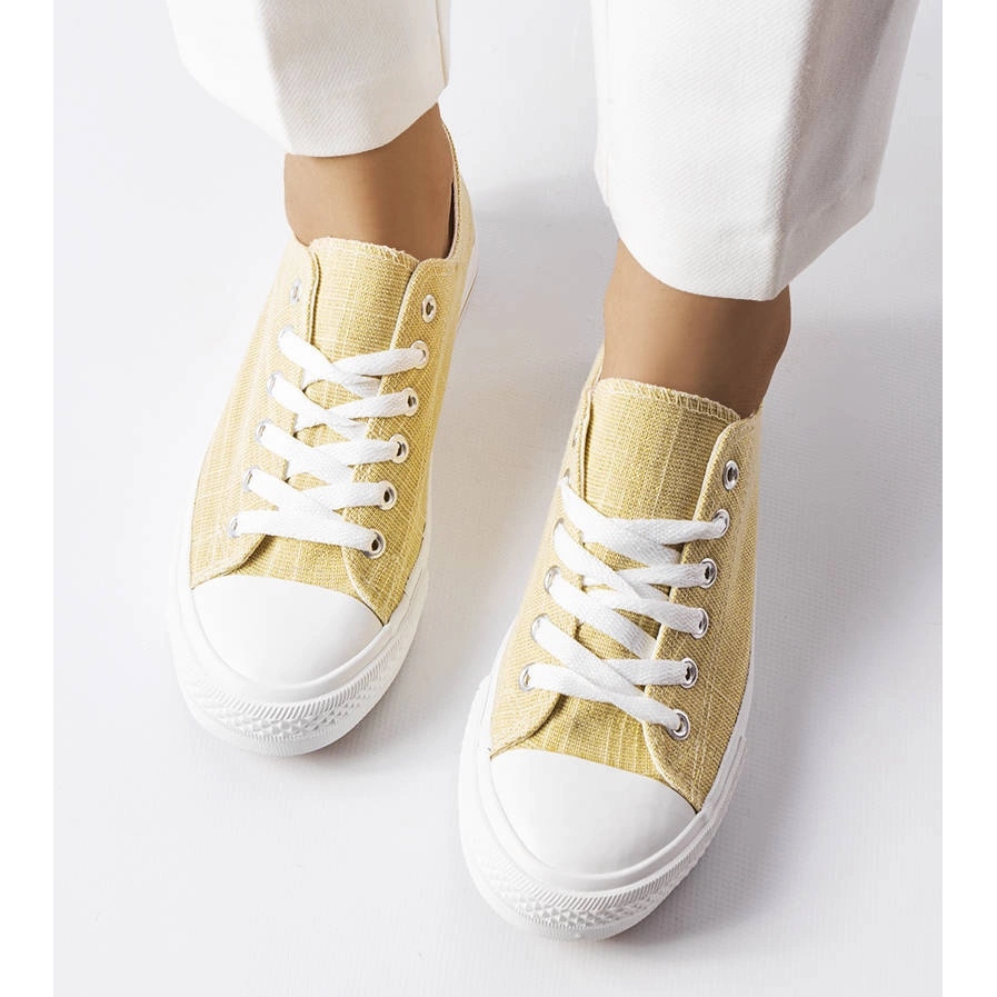 Les baskets sont des chaussures basses et élégantes conçues pour les femmes. Elles sont fabriquées en matière textile avec une finition dorée brillante, ce qui donne aux chaussures un éclat tendance. Elles présentent un bout arrondi en caoutchouc et des lacets plats. La tige arrive au-dessus de la cheville, ce qui leur confère un style universel.