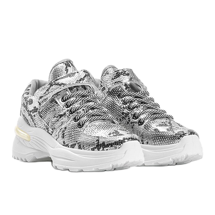 La couleur argentée associée au motif peau de serpent leur ajoute un peu d'exotisme et de singularité. La semelle haute en forme de coin, de 5,5 cm de hauteur, met joliment en valeur la silhouette tout en assurant stabilité et confort au porté. Les baskets sont lacées et équipées d'une fermeture fermeture scratch supplémentaire, ce qui augmente leur fonctionnalité et les rend plus faciles à enfiler.