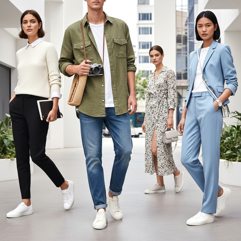 Les baskets fines blanches ou crème sont particulièrement impressionnantes avec un costume de printemps, pour femme ou pour homme. C’est l’une des principales tendances streetstyle de 2026 : la formalité combinée à la décontraction sportive. Choisissez ce look si vous voulez avoir l’air élégant et moderne.