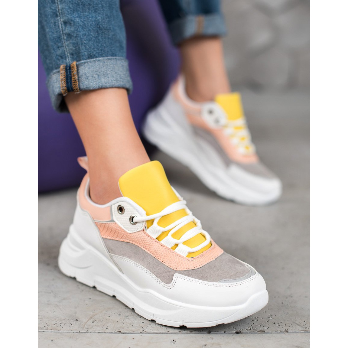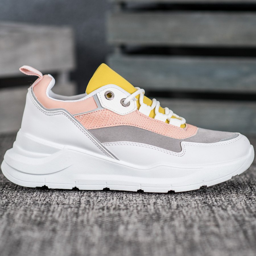 Les baskets à plateforme SHELOVET sont le choix parfait pour les femmes modernes qui souhaitent allier confort et look tendance. Ces chaussures blanches et multicolores présentent un design minimaliste dans des tons dominants de blanc et de gris, complétés par des éléments jaunes originaux. Cette combinaison rend les baskets non seulement élégantes, mais aussi uniques.