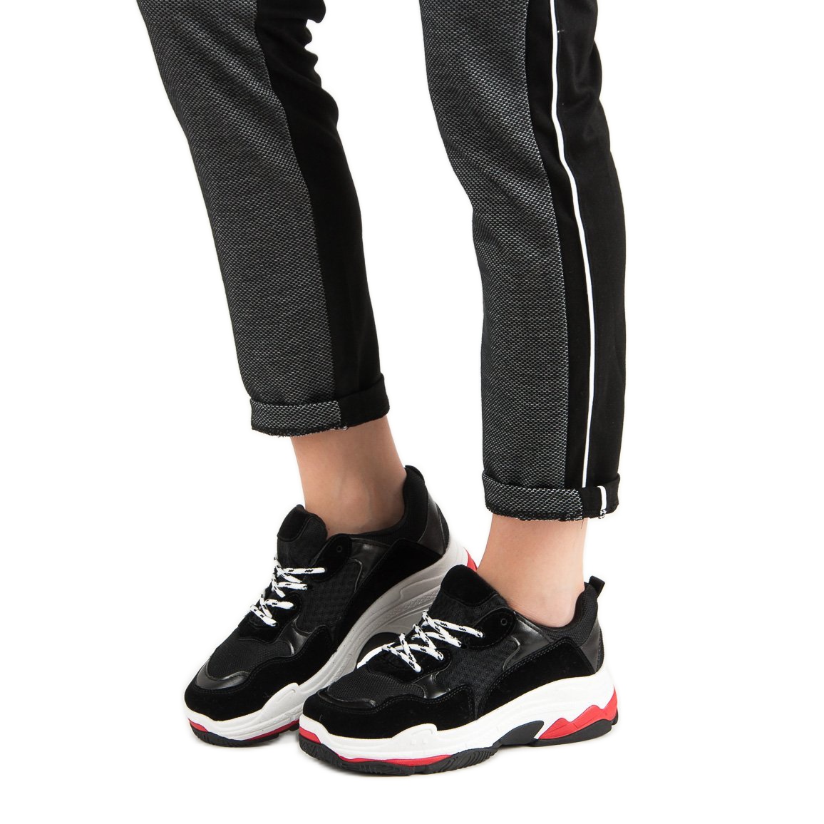Une plate-forme haute de 5 cm permet aux baskets non seulement d'ajouter de la hauteur, mais aussi d'assurer la stabilité, protégeant la cheville et l'articulation de la cheville. Grâce à l'utilisation de matériaux combinés, les chaussures correspondent parfaitement aux tendances actuelles et leur couleur noire classique convient à de nombreux styles.